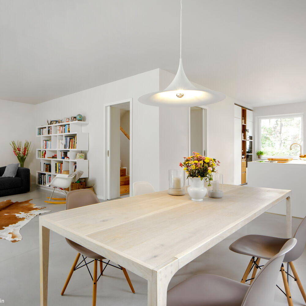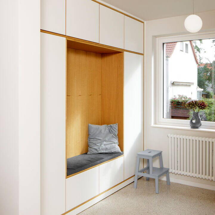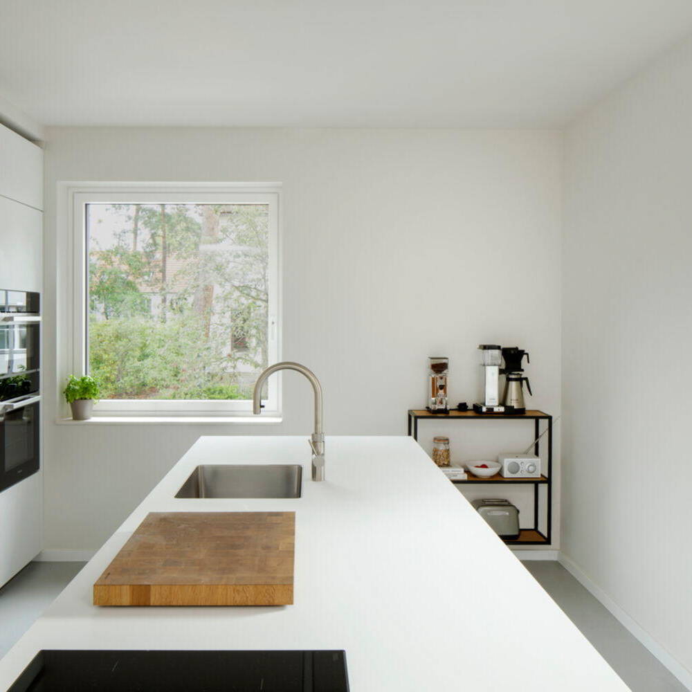 Creating an open, flowing ground floor with living, kitchen, and dining areas meant removing the cramped compartmentalized rooms of the original layout. This required carefully supporting all walls above with concealed structural elements—maintaining visual clarity without exposed beams. The kitchen, once cramped and dark, now opens gracefully toward the stairwell and has been reimagined as an entry vestibule, its original terrazzo flooring preserved. Expansive floor-to-ceiling sliding doors on the garden side flood the interior with natural light. Bright white plaster now envelops the exterior—a striking counterpoint to the decades of neglect it endured. Beyond its visual and aesthetic transformation, the home was brought to modern energy standards. The deliberate dialogue between old and new gives this Berlin family's residence a distinctive character all its own.