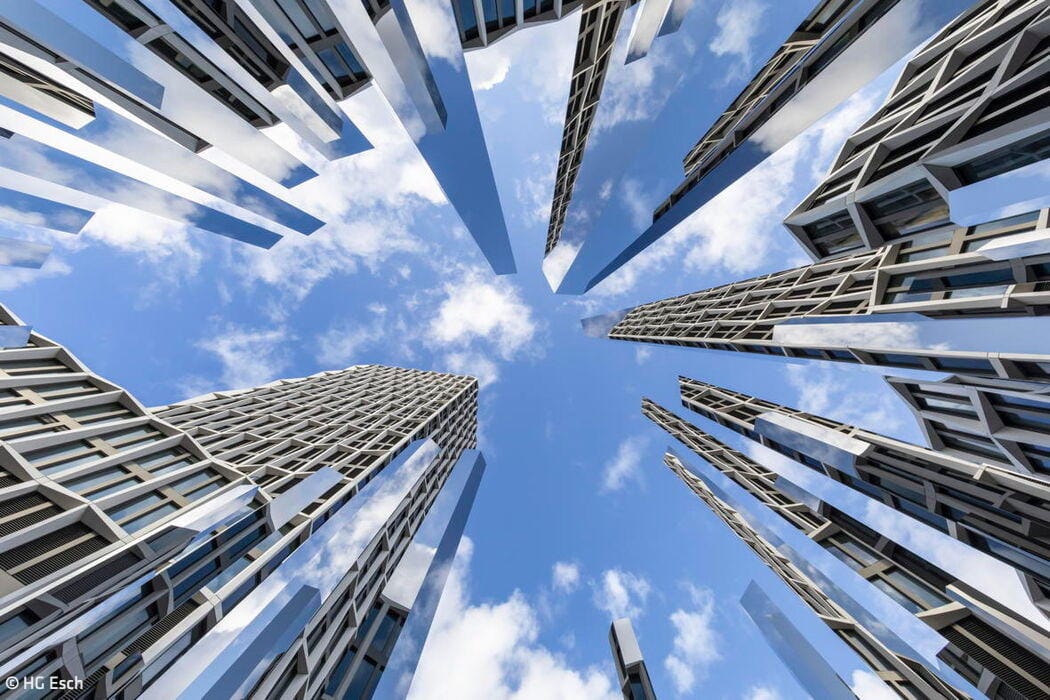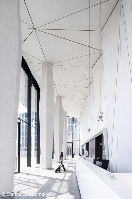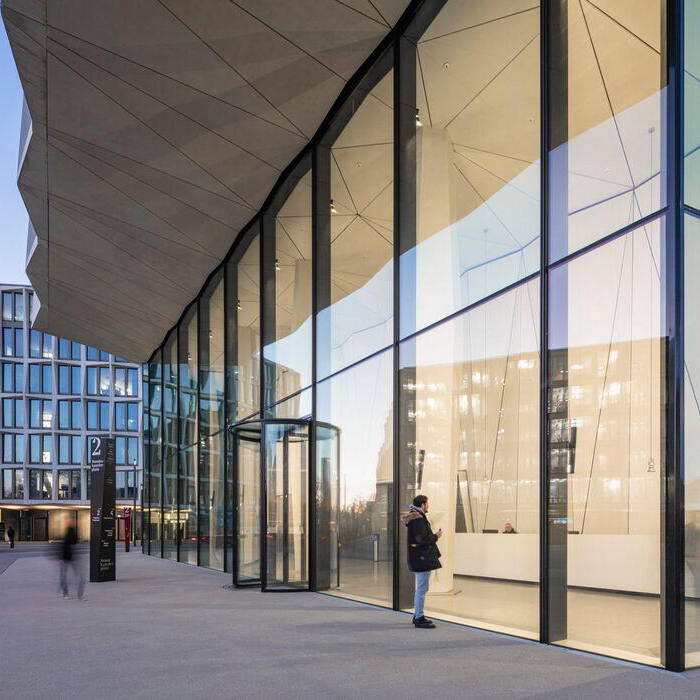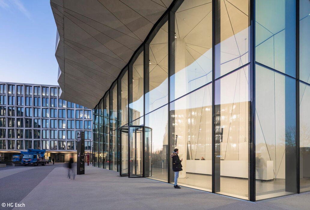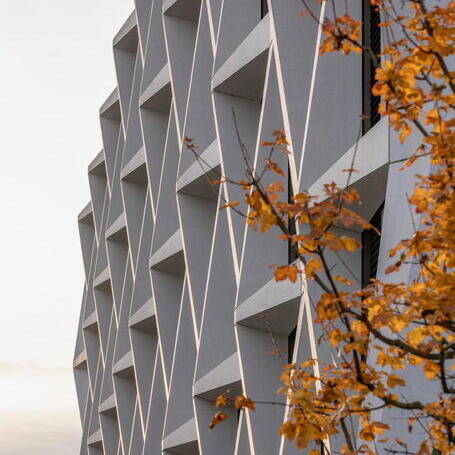 Achieving a cohesive, monolithic façade across all three buildings—regardless of construction methods or timing—required meticulous attention to concrete composition. The façade's geometric patterning creates a dynamic visual effect that shifts subtly with changing light and perspective. The two lower buildings employ load-bearing façade grids, freeing their office floors from interior columns entirely. For the tower, façade panels span two storeys vertically, and three in the base, emphasizing its soaring height. A conventional reinforced concrete skeleton was clad with glass-fibre-reinforced concrete panels to achieve this vision. The design carries through into the building foyers, where triangular façade elements wrap both ceiling and walls—reaching up to eleven metres in the tower's dramatic three-storey entrance hall. Beyond its striking aesthetic, the project has earned LEED Gold pre-certification, demonstrating its commitment to sustainable design.