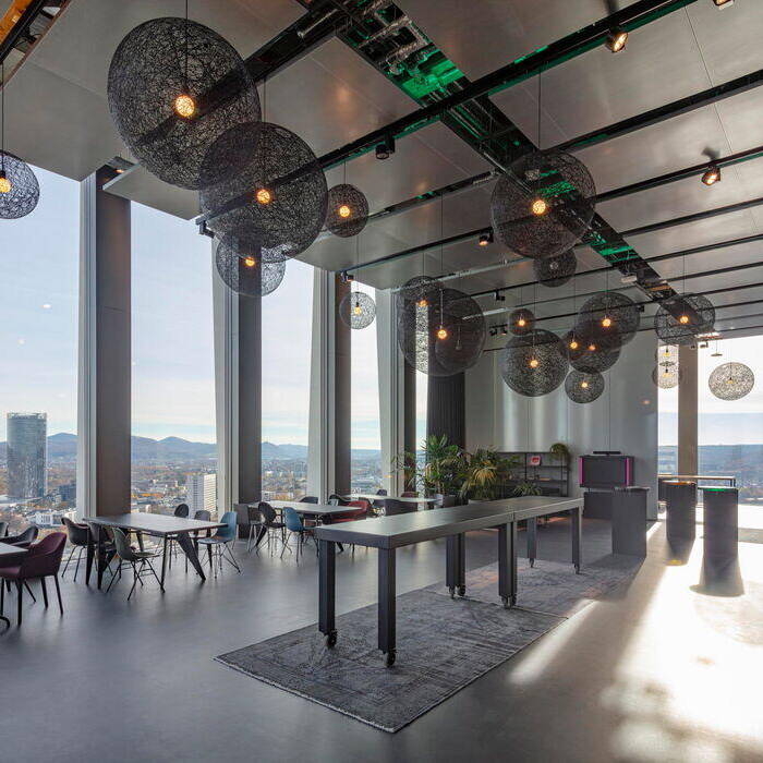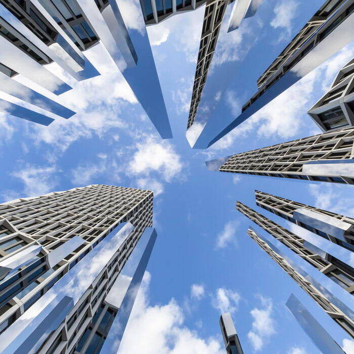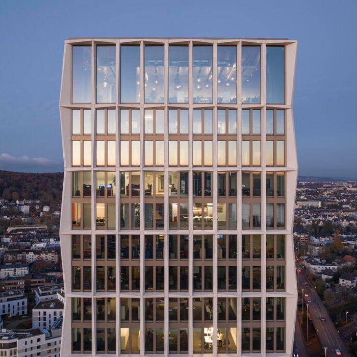 The striking new building complex replaces the aging Bonn Centre—which for nearly 50 years defined the cityscape with its 18 floors while blocking key sightlines and movement corridors. The redesign creates a graceful transition to the residential neighborhoods to the south, achieving this for the first time. Three sculptural forms with irregular footprints settle into the corners of the triangular site, anchoring a vibrant central plaza. The prestigious foyers of the new office towers and a public restaurant, each with their own forecourts, face this thoughtfully designed public realm. Danish artist Jeppe Hein realized his walk-in artwork "Mirror Pavilion" on this site. Rising from one of the buildings stands a striking 28-story tower reaching just over 100 meters—a slender vertical accent that powerfully grounds the project within Bonn's urban landscape. Alongside Egon Eiermann's "Langer Eugen" and Helmut Jahn's "Post Tower," this tower becomes a defining new landmark that reshapes the city's iconic silhouette. Beyond diverse office tenants, Design Offices curates a versatile range of spaces for events, conferences, and collaborative work. The entire ensemble is unified by a striking façade of white architectural concrete—acid-treated and engineered with advanced water-resistant properties—creating a cohesive visual identity.