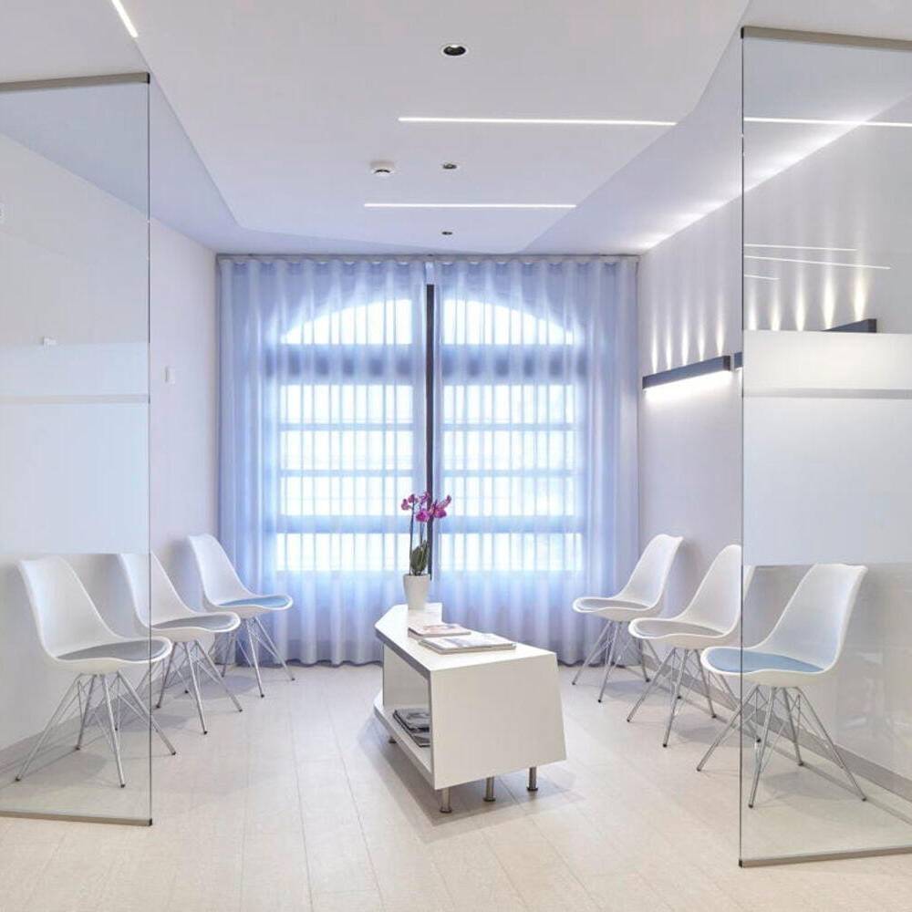 This harmony extends to the reception and consultation areas, which are intuitively connected—patients navigate with ease, and the practice's workflow is immediately clear. The architects employed angled walls and curved elements to infuse spaces with visual dynamism, strategically positioned areas for function, and eliminated wasted or undefined corners. The result is a flowing spatial design where aesthetics and functionality work seamlessly together.