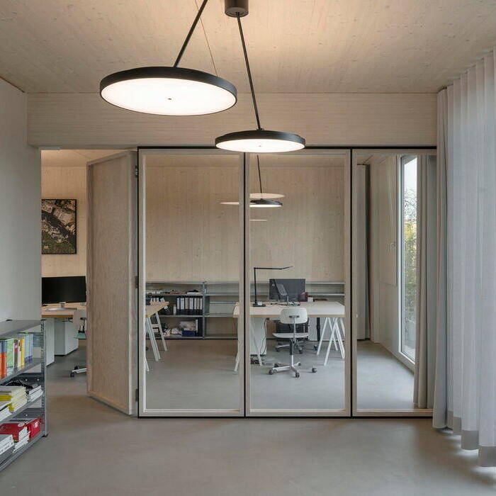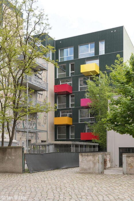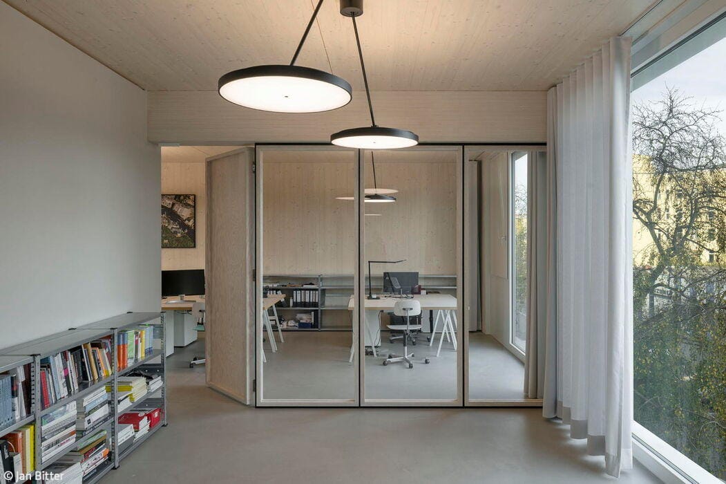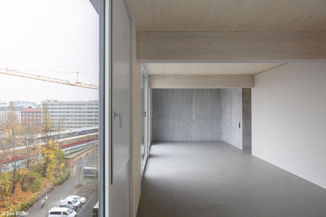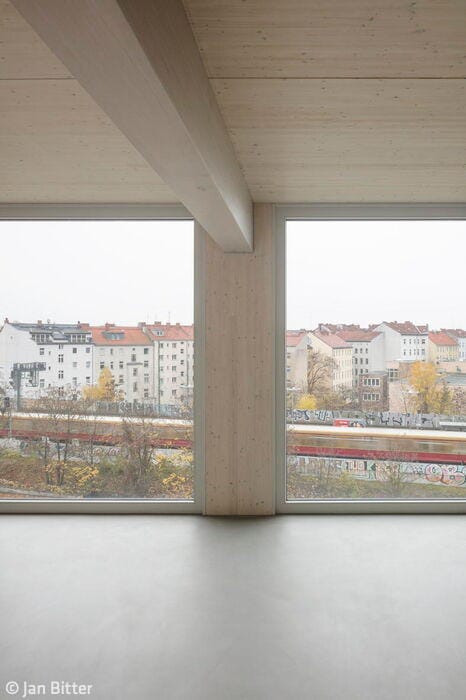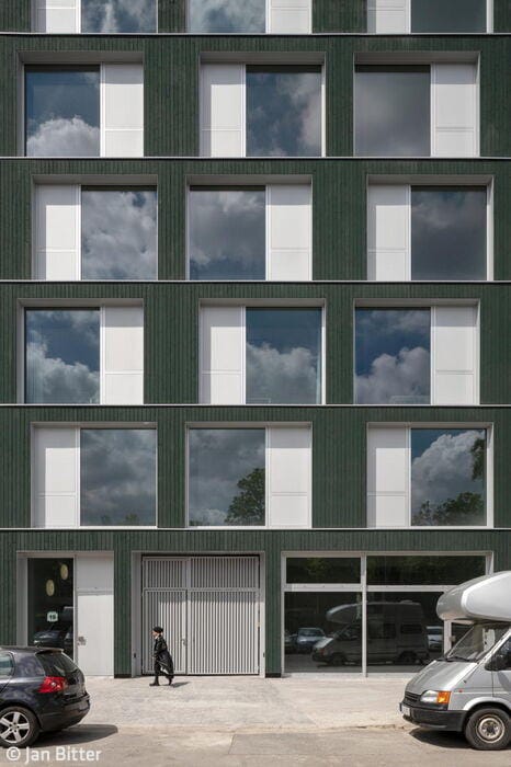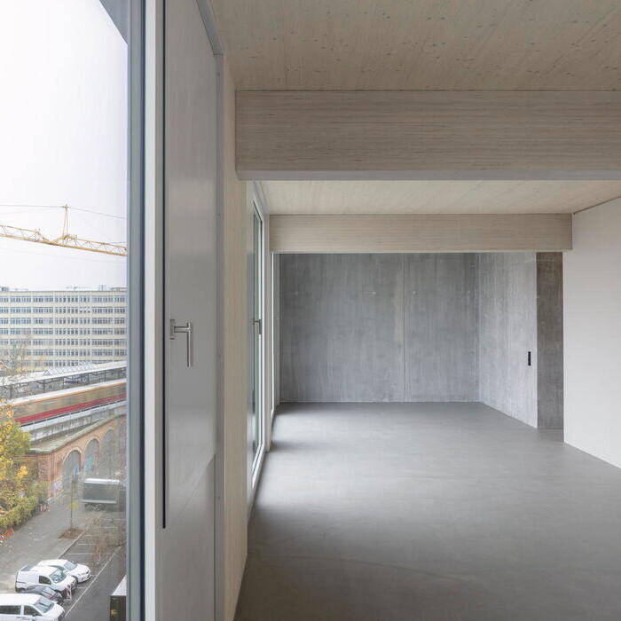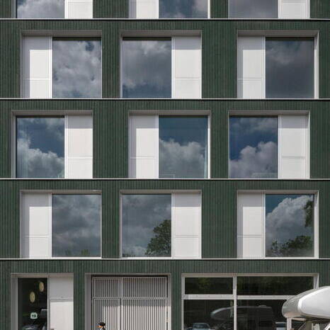 The street-facing east façade features loggias only on the top floor—a practical choice given its proximity to the railway embankment. By contrast, the rear west side opens onto balconies with colorful balustrades. The new building sits directly adjacent to a shorter structure on its left, and borders a historic industrial building on its right. Despite its strikingly contemporary design, the new façade achieves a harmonious relationship with its neighbors: the industrial building's vertical and horizontal wall articulation resonates beautifully with the new building's ribbon windows. Architects Holzer Kobler (Berlin) and Zweikant (Cologne) prioritized wood as their primary building material wherever structurally feasible. The basement, ground floor, and stairwell were cast in reinforced concrete, while the hybrid timber construction represents the maximum timber content possible for a structure of this scale. The façade itself—a ventilated curtain system of spruce wood finished with organic Swedish weatherproof coating—brings warmth and durability to the exterior. The floor plans for both offices and apartments were designed with flexibility in mind, adapting easily to diverse occupancy needs. Staggered white window frames provide striking visual punctuation, creating a compelling contrast against the muted dark green façade.