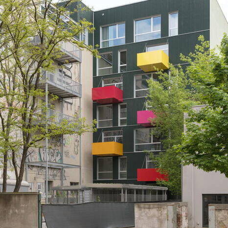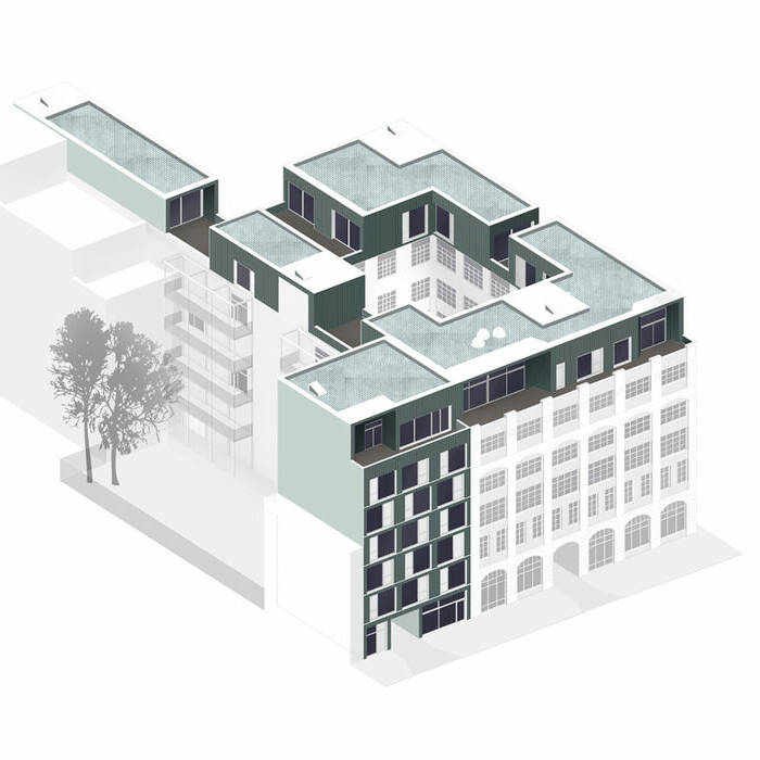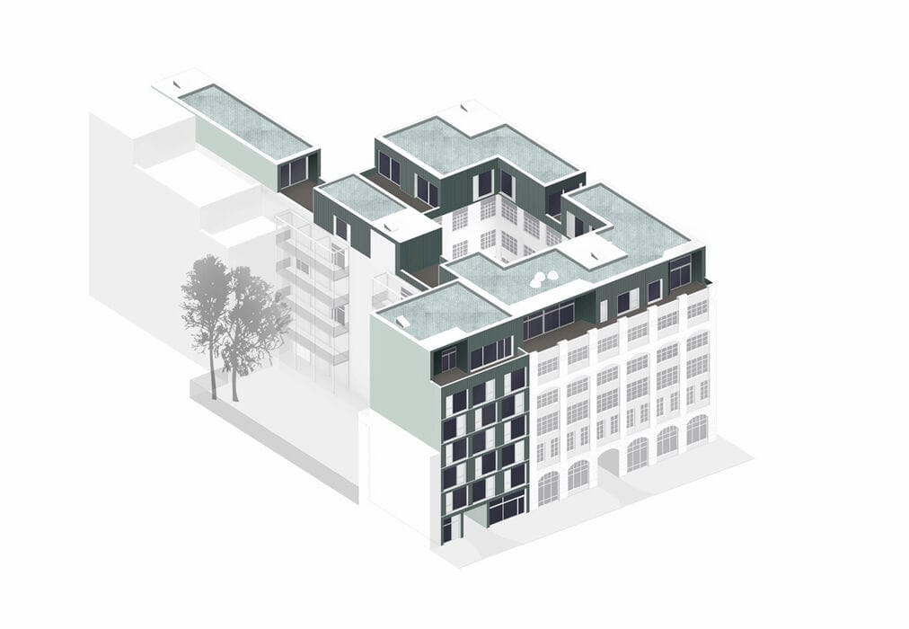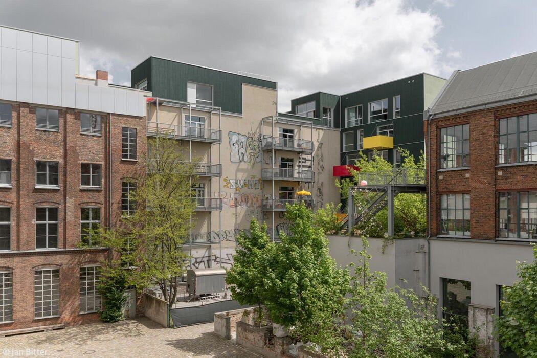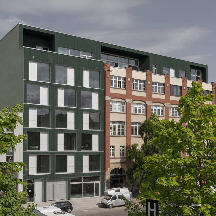 There's one more strategic move worth noting: the new tower and the existing industrial building were brought into alignment through a clever intervention—the lower industrial structure was extended upward. This addition extends the tower's seventh-floor language seamlessly: the same green frames, loggias, and closed façade elements continue the architectural conversation while adding another residential floor to the street frontage. The north side wing and the courtyard buildings received similar extensions, creating a unified, cohesive height profile across the entire ensemble. The result is a striking example of vertical densification that maximizes the site's potential.