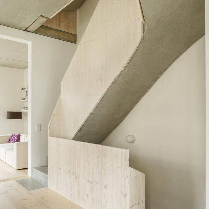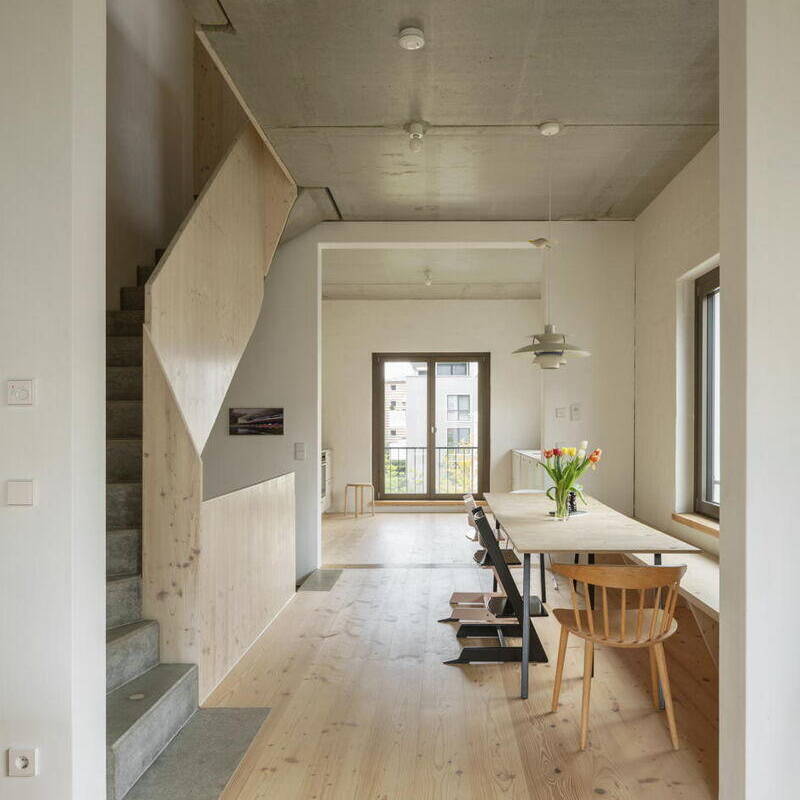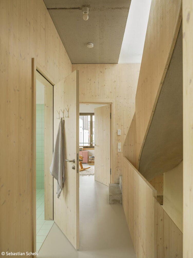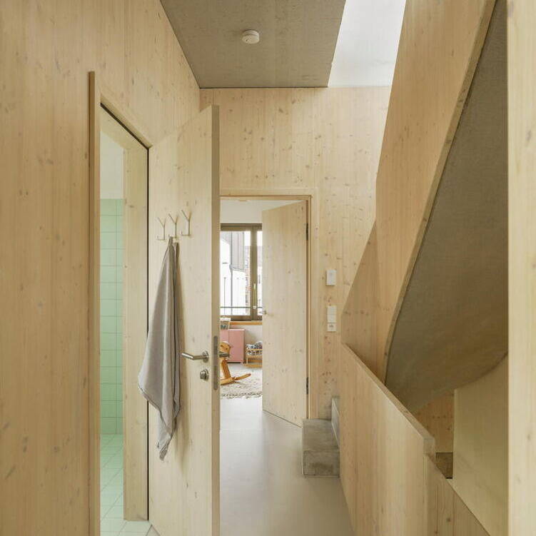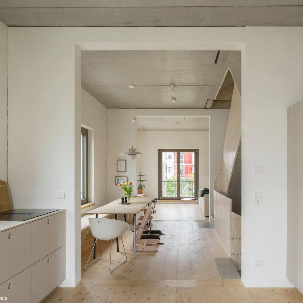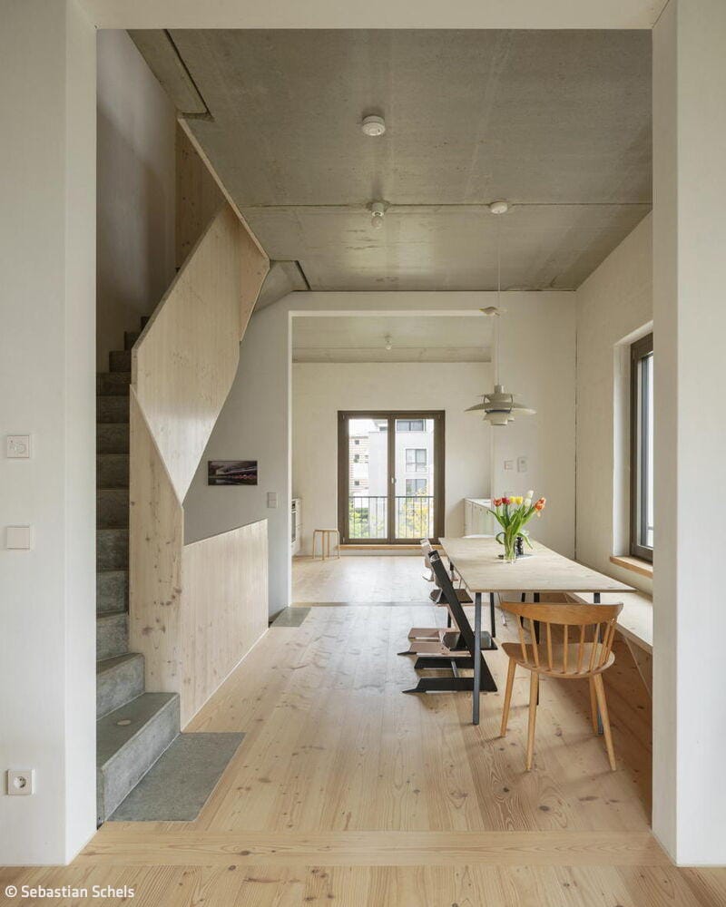 Nestled in Kirchheim unter Teck's vibrant urban neighbourhood—characterized by high density and exceptional quality of life—this unconventional residence occupies a constrained 4.5-metre-wide by 12.5-metre-long lot between an apartment block and a passage connecting two inner courtyards. Mehr* architects responded by dividing the narrow footprint into three identical modules arranged in sequence. Each 16 m² room rises to 3.1 metres and follows a deliberately "neutral" design strategy: functionally equivalent and fully interchangeable. This flexibility allows the ground floor and second-floor end spaces to evolve with the family's changing needs throughout their life stages. A consistent window rhythm across the gridded façade reinforces this design principle of equal value, expressed visibly to the street.