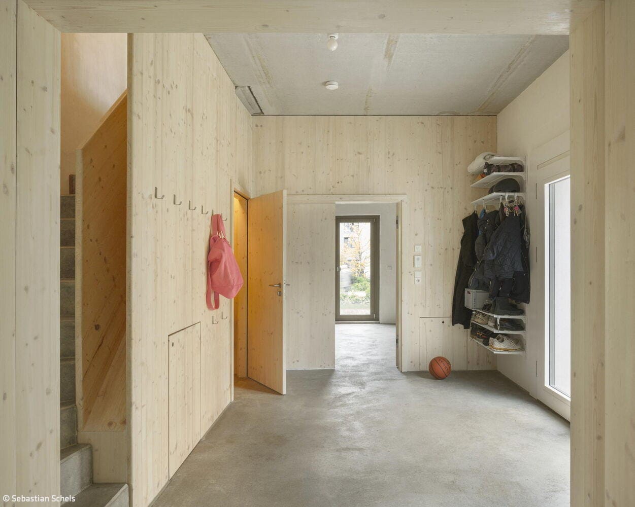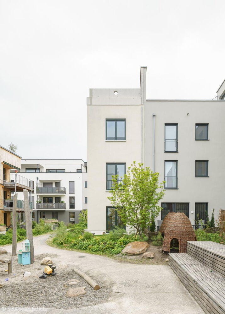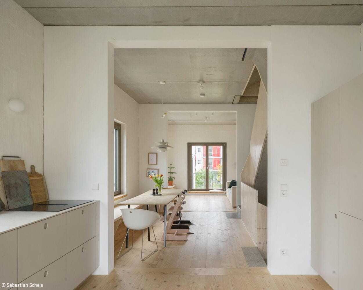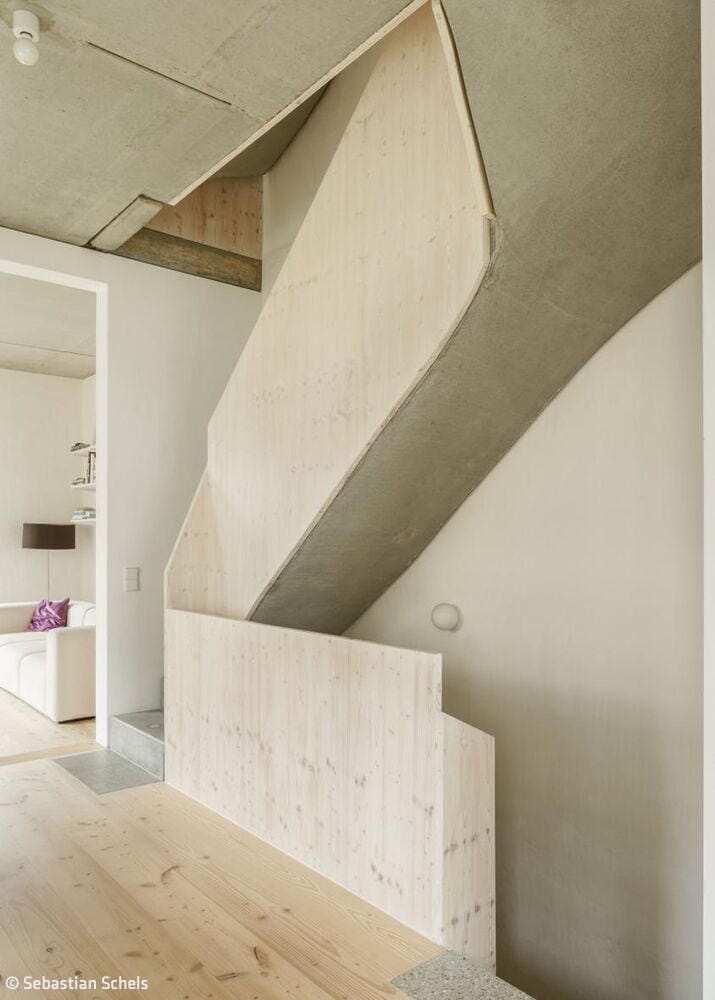 Nestled in Kirchheim unter Teck's vibrant urban neighbourhood—characterized by high density and exceptional quality of life—this unconventional residence occupies a constrained 4.5-metre-wide by 12.5-metre-long lot between an apartment block and a passage connecting two inner courtyards. Mehr* architects responded by dividing the narrow footprint into three identical modules arranged in sequence. Each 16 m² room rises to 3.1 metres and follows a deliberately "neutral" design strategy: functionally equivalent and fully interchangeable. This flexibility allows the ground floor and second-floor end spaces to evolve with the family's changing needs throughout their life stages. A consistent window rhythm across the gridded façade reinforces this design principle of equal value, expressed visibly to the street.