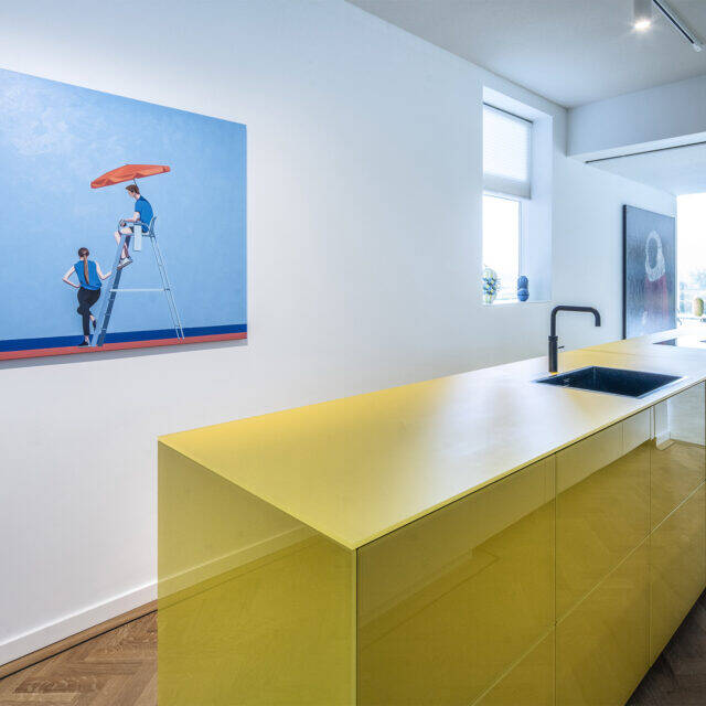 The architects at Reset Architecture were tasked with creating a kitchen that would be worthy of the gallery's refined spaces. Artematica achieves this through its disciplined approach to design: there's no separation between innovation and minimalist aesthetics, between the artistry of colour and material play and the precision of pure geometry. The kitchen's elegant yellow glass surfaces dialogue with the bold contemporary works displayed throughout the gallery, establishing a visual continuity that dissolves the boundary between domestic and exhibition space.