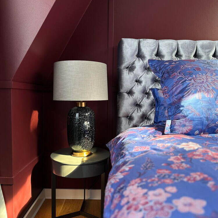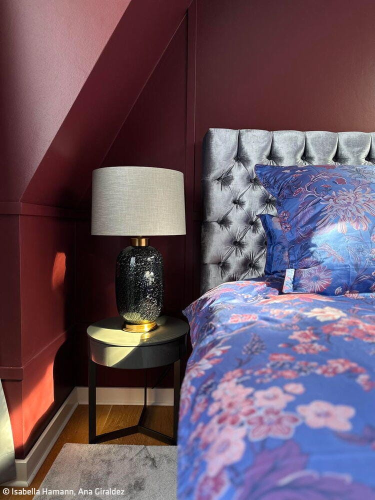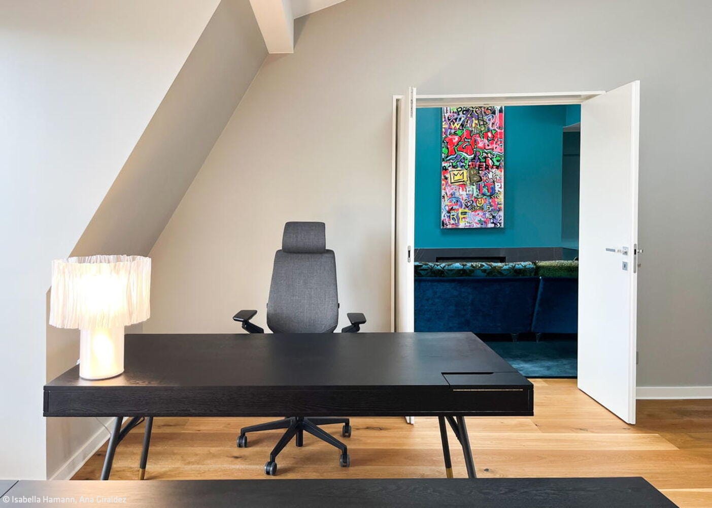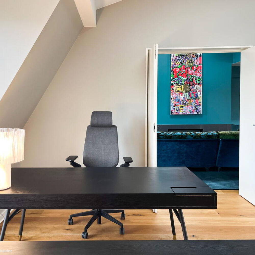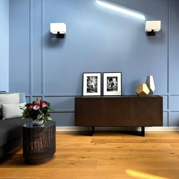 The result is a seamless marriage of technology, design, and comfort—a distinctive living experience that hovers above the city. Yet the show-stoppers are undoubtedly the bold wall colors. The owners' willingness to embrace color gave Hamann remarkable creative latitude, fundamentally shaping each room's character. The living room glows in a deep turquoise that adds depth and sophistication. The bedroom wraps in warm charcoal red, while the fitness and guest area energizes with a crisp, invigorating sky blue. Running throughout is solid brushed and oiled oak flooring—a grounding element that brings visual calm to the entire composition. Custom furniture pieces from the Berlin studio, with its new Italian outpost, complete the refined interior.