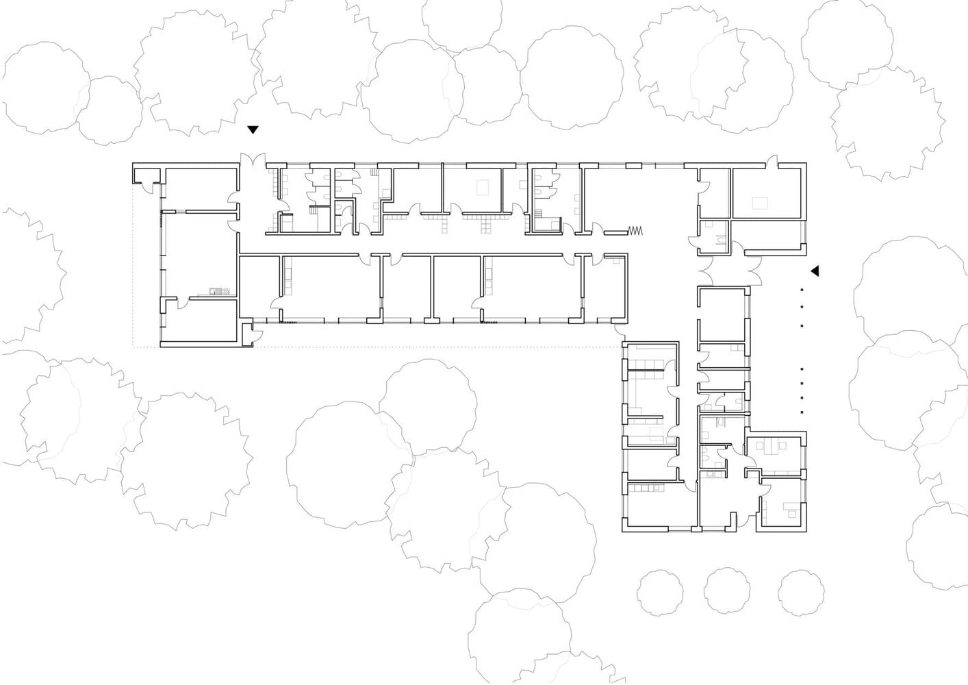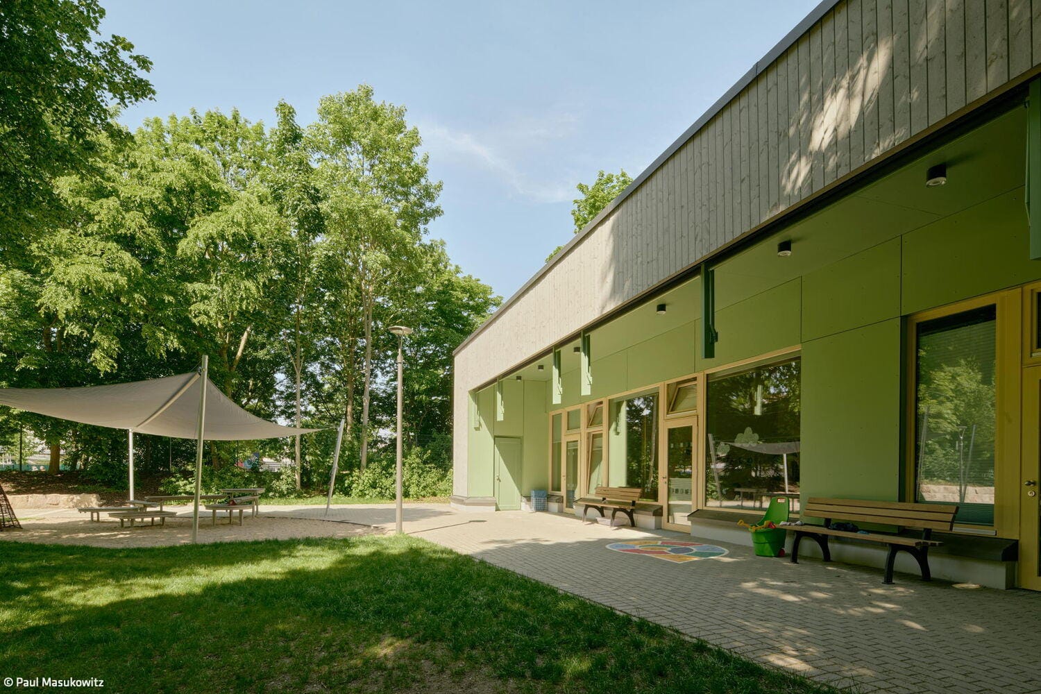 The new nursery sits conveniently along Ulenbergstraße, adjacent to the park's central parking area. The site underwent complete remediation—paved surfaces, planted areas, sandpits, and a boules court gave way to thoughtful development that restored the landscape. The reclaimed areas now feature innovative biodiversity measures. The single-storey building comprises a concrete base topped with timber frame construction and a closed, rear-ventilated timber façade. Its L-shaped floor plan organizes spaces by function: the long wing houses three group rooms that open southward toward the park with covered terrace areas, providing both outdoor access and natural shading. Service spaces—corridors, restrooms, and cloakrooms—occupy the northern side, creating a buffer for the group areas. To the west, a separate kitchen and storage facilities complete the layout. The shorter eastern wing holds staff rooms and integrates the independently accessible offices of the municipal parks department. At the junction of the two wings lies the main entrance, positioned to open both outward and upward—a gesture that strikes a welcoming, open, and inviting tone.