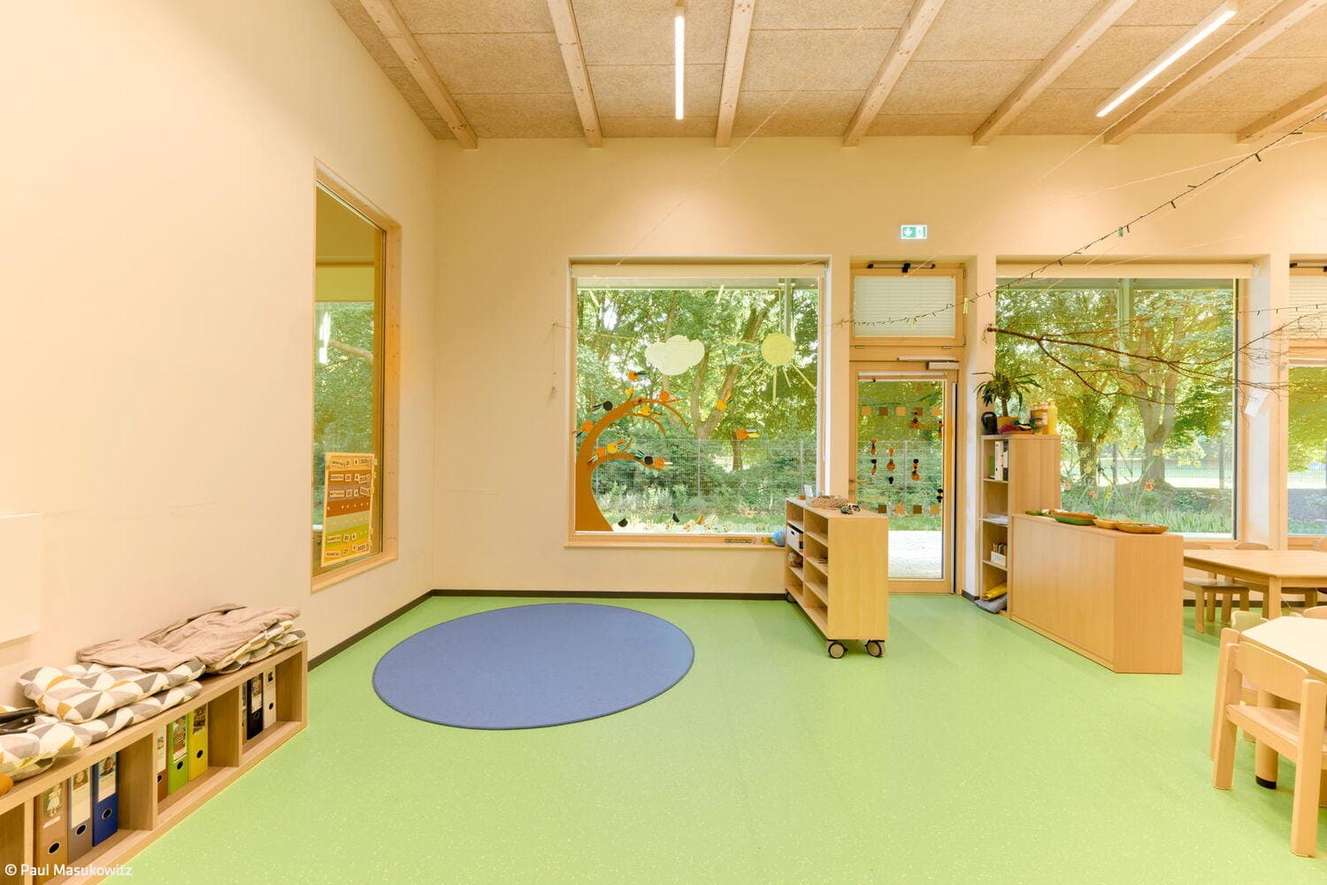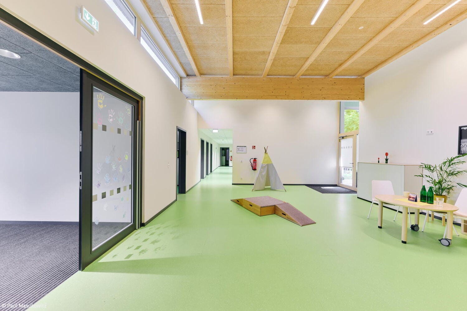 A movable partition in the foyer creates flexibility, allowing the space to transform into a multipurpose room for events like nursery celebrations. The interior corridor, which runs through the building, is equally thoughtful in design: a clerestory band—created by the height offset between building sections—floods the corridor with natural light while facilitating cross-ventilation throughout the rooms. The exposed timber beam structure, enhanced with acoustic panels, pairs beautifully with rubber flooring and accent wall colors. Environmentally, the building performs impressively through an air-to-water heat pump system and photovoltaic panels installed on the fully planted roof areas.