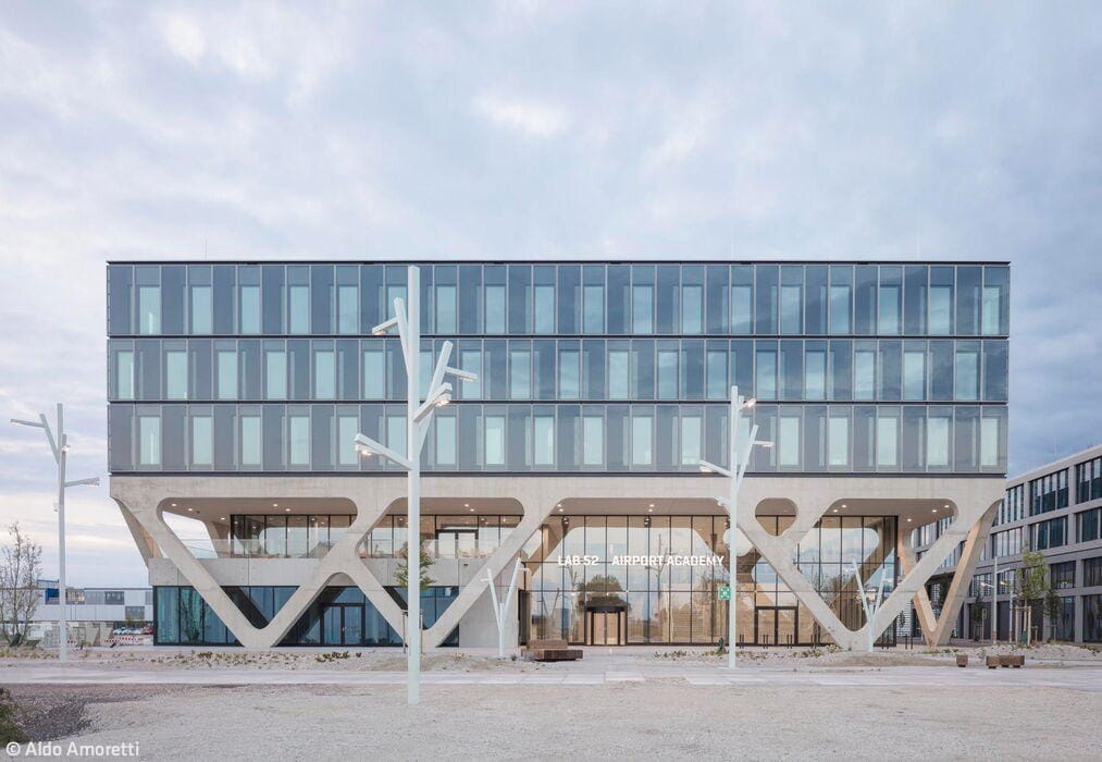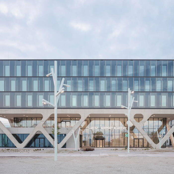 Munich Airport is building an innovation campus across an expansive 26-hectare site—roughly the size of 70 football fields. Dutch architects and urban planners Kees Christiaanse Architects & Planners created the master plan. Lab 52 AirportAcademy, the second structure to open, takes its place at Pioneer Square, designed by Auer Weber alongside the neighboring Lab 48. The campus is easily accessible via the S-Bahn (Besucherpark station). True to its motto—"Connect, Create, Collaborate"—a smart city is gradually emerging on this innovative campus.