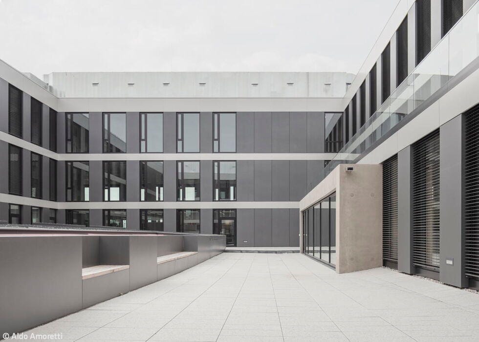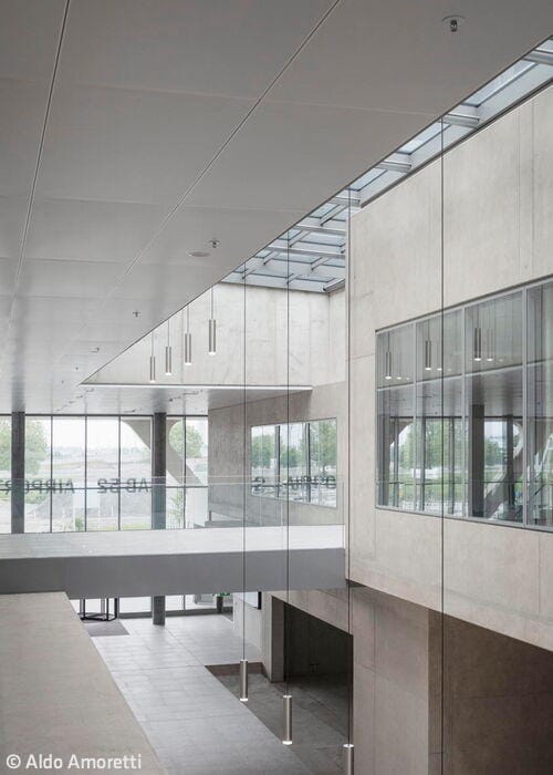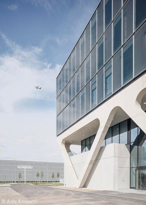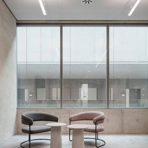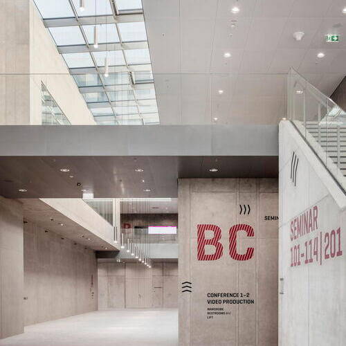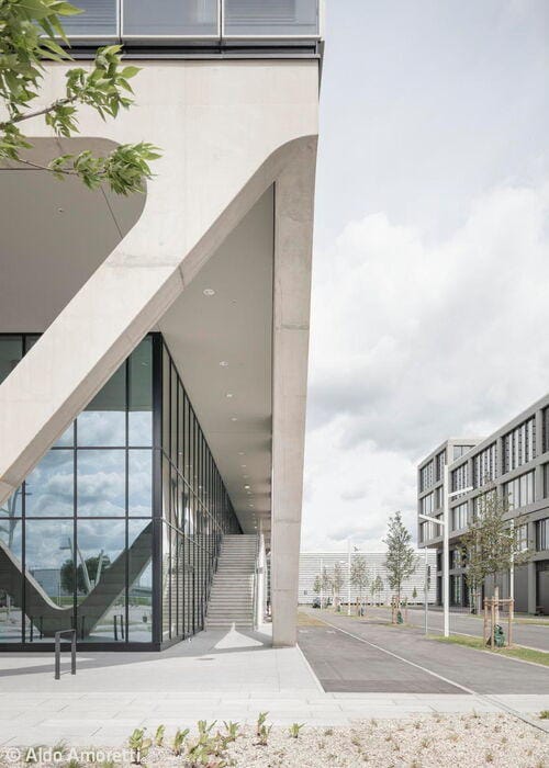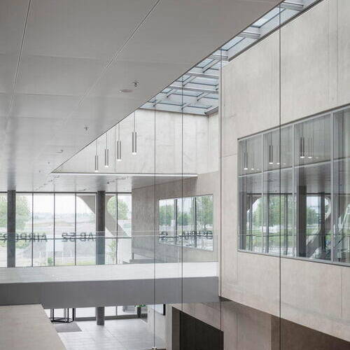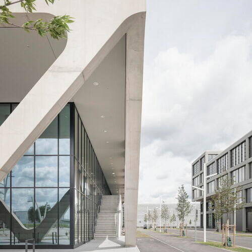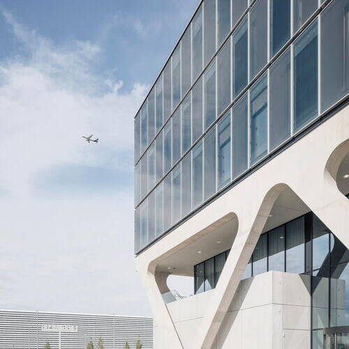 The campus brings together research institutions, high-tech industries across sectors, startups, and top talent—all under one ambitious vision. Twenty-nine buildings will eventually comprise the development, creating a vibrant blend of work and leisure in an urban setting. The AirportAcademy exemplifies this vision through bold, iconic architecture. Its signature feature: an expressive exposed-concrete framework wrapping the two-storey base, which provides both foundation and structural support. Above sits an elegant three-storey glass cube. The concrete struts are an inspired design move—their pattern echoes the very runways and taxiways of Munich Airport itself. Inside, alongside office space, you'll find expansive conference areas, state-of-the-art seminar rooms, and a dramatic two-storey lobby crowned with a glass roof. The venue accommodates 500 guests for events, while a café bar and dining options keep daily occupants well fed.