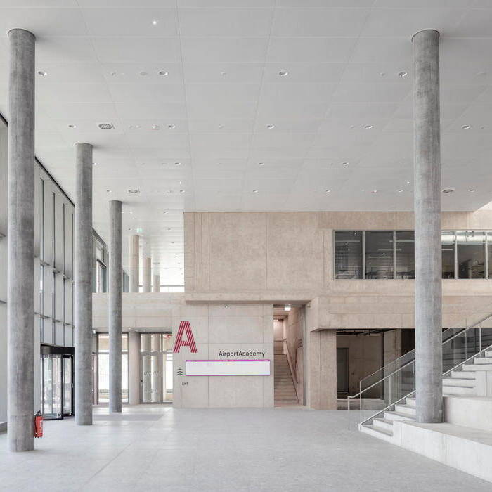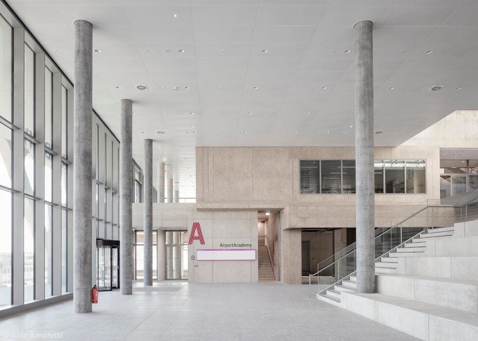The building's streamlined three-story glass-fronted section contains office spaces and collaborative group rooms, all arranged around a central courtyard. Airport management has claimed the two basement levels for its own operations, housing specialized training programs focused on aviation-critical areas: airport operations, safety and security, crisis management, and cyber security. The curriculum blends theoretical instruction with hands-on, scenario-based exercises.