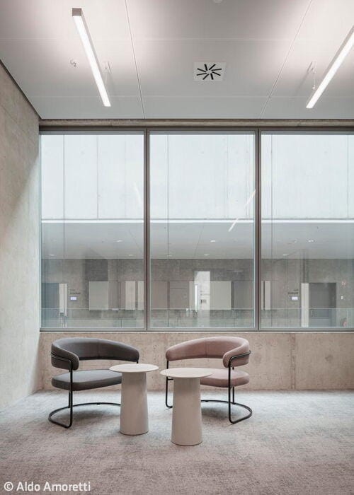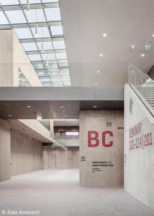 The campus brings together research institutions, high-tech industries across sectors, startups, and top talent—all under one ambitious vision. Twenty-nine buildings will eventually comprise the development, creating a vibrant blend of work and leisure in an urban setting. The AirportAcademy exemplifies this vision through bold, iconic architecture. Its signature feature: an expressive exposed-concrete framework wrapping the two-storey base, which provides both foundation and structural support. Above sits an elegant three-storey glass cube. The concrete struts are an inspired design move—their pattern echoes the very runways and taxiways of Munich Airport itself. Inside, alongside office space, you'll find expansive conference areas, state-of-the-art seminar rooms, and a dramatic two-storey lobby crowned with a glass roof. The venue accommodates 500 guests for events, while a café bar and dining options keep daily occupants well fed.