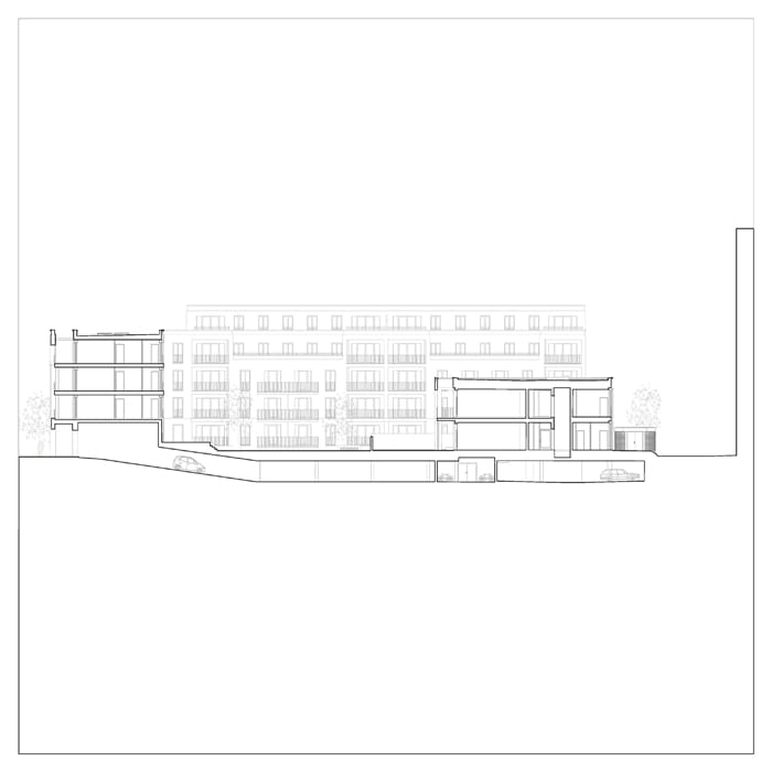Hermeskeiler Platz, anchored by its weekly market and tram terminus, has long been the vibrant heart of Cologne-Sülz and a sought-after residential location. The new four-storey residential and commercial building marking the square's eastern edge makes a bold departure from the austere post-war structures surrounding it. Its richly articulated south façade commands attention with five clearly defined axes oriented toward the square. Striking profiled archways articulate a sheltered arcade along the base, creating a protected forecourt for the integrated ground-floor café and bakery. Above, the loggias are unified vertically and crowned by arched openings, yielding generous, weather-protected outdoor spaces that complement the one- to three-room flats.