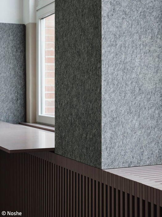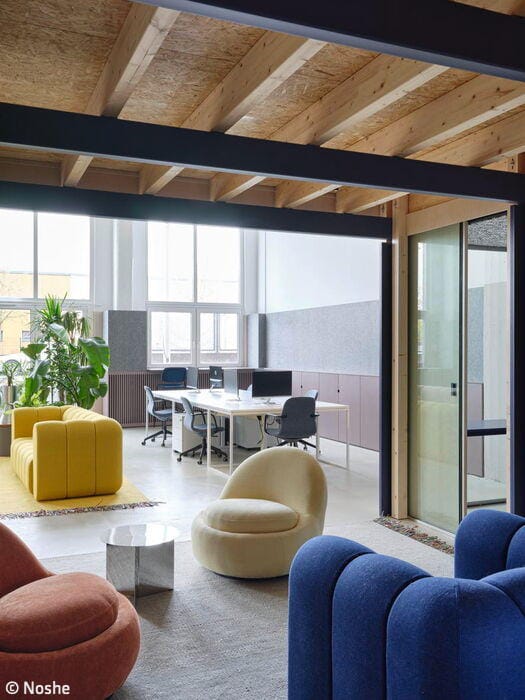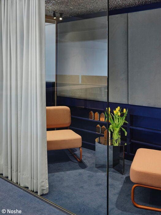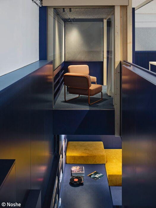 Ester Bruzkus and her team started by expanding the existing mezzanine level, creating an L-shaped platform above an open work area. The section without a false ceiling sits along the façade with expansive windows, perfect for open or enclosed work. The mezzanine itself becomes the "living room" – a shared hub connecting to smaller, private "pods" where employees can focus in quiet. Acoustics were key: the team used fabric, felt, and open-cell aluminum to manage sound. This thoughtfulness reflects Relaxound's identity – a company known for chirping boxes that mimic birdsong. After all, their name says it all: it's about relaxation. Every design choice, from color palettes to furnishings, had to honor this ethos.