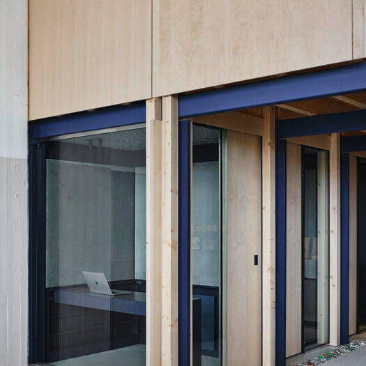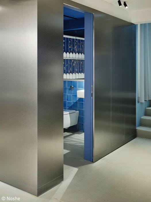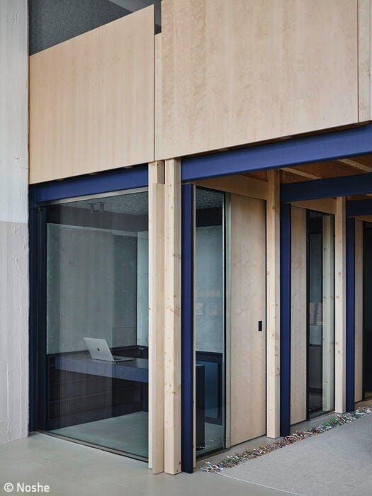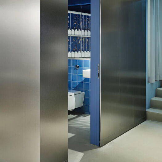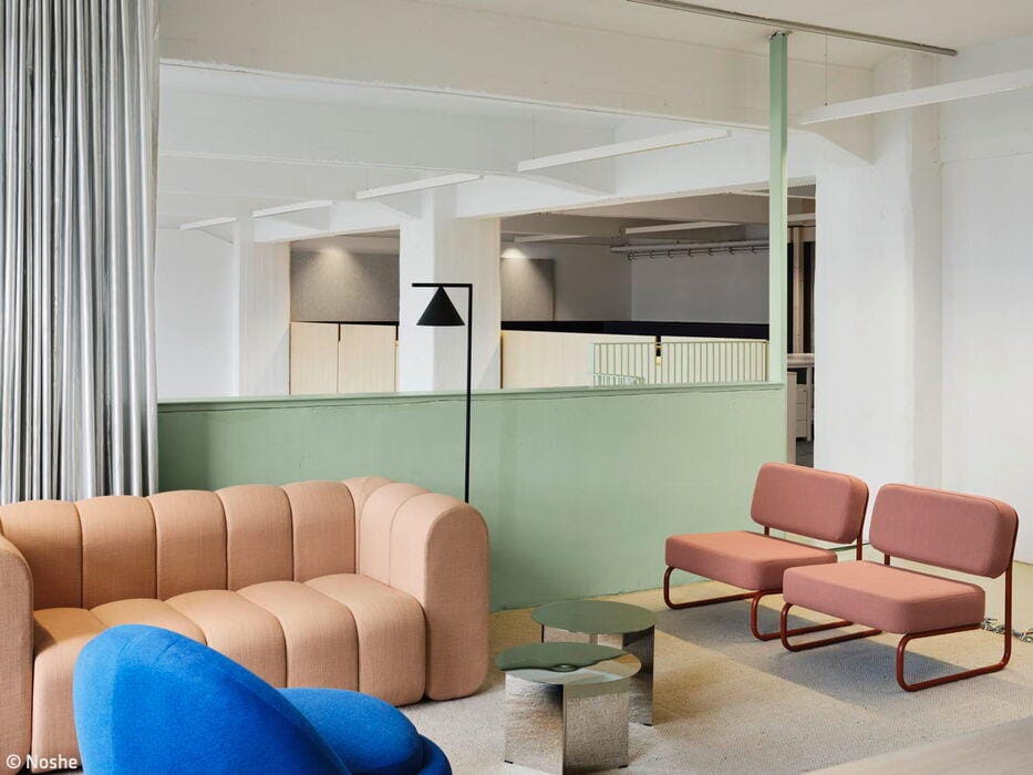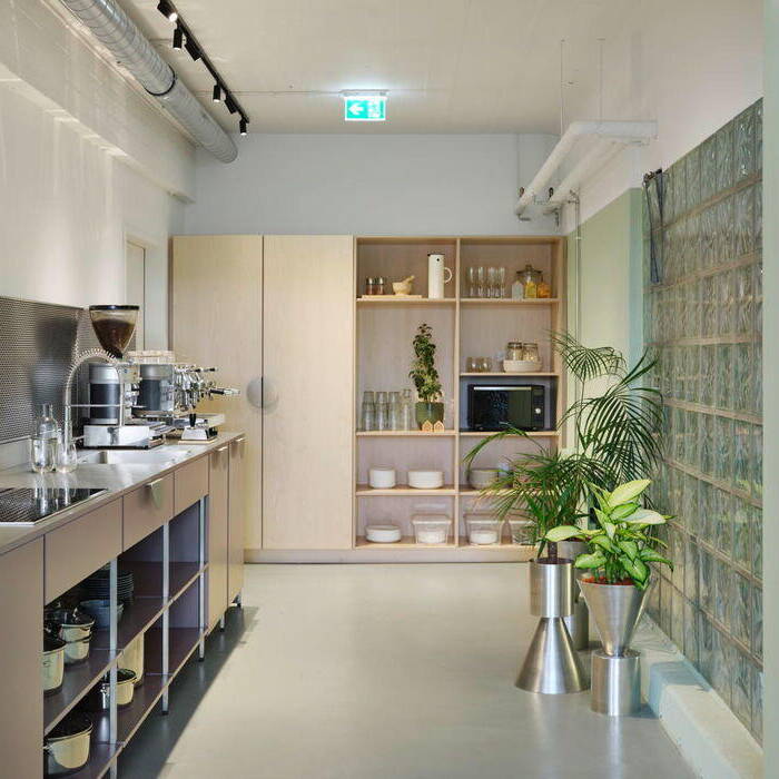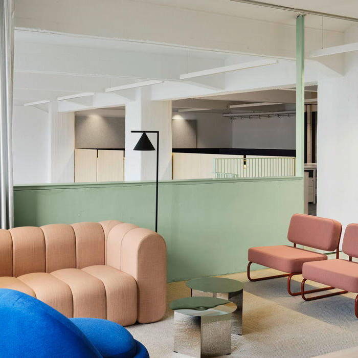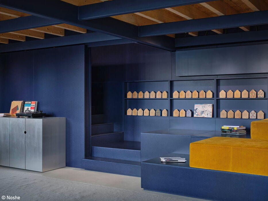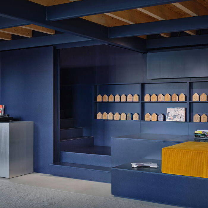 The "living room" features soft, understated tones – think comfortable armchairs and sofas in rose hues against pale lime-green walls. To match the gallery level with existing fixtures, the designers created bespoke room modules in steel and wood. Here, a serene dark blue dominates the walls, furniture, and solid-color MDF fixtures. A blue staircase then ascends to the upper floor, home to additional shared spaces including a kitchen and dining area bathed in soft lime green. The result? An office that adapts to how people actually work. As Peter Greenberg, Ester Bruzkus's partner, puts it: "The design marries workplace efficiency with the warmth of home."