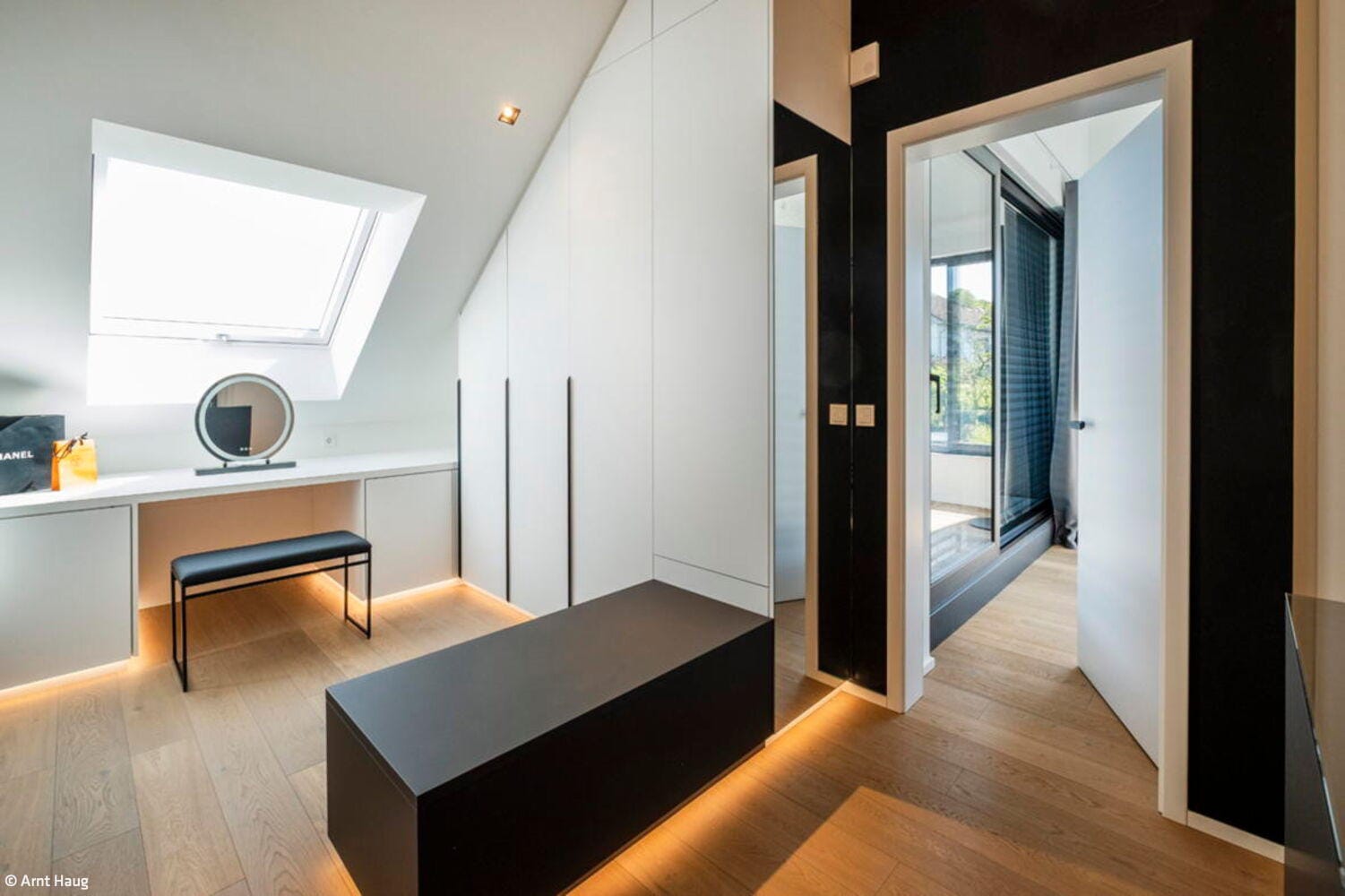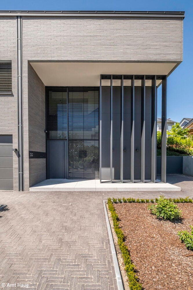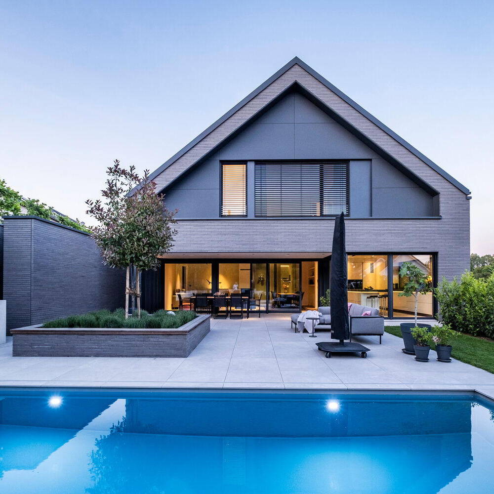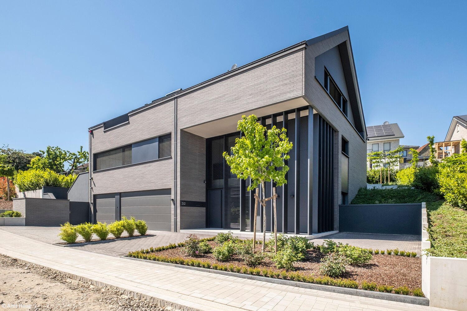 The façade showcases grey elongated clinker brick in subtle tones, conveying quiet elegance. Recessed sections – at the gable and entrance – are articulated with aluminium cladding panels. The attic opens fully to the ridge line, amplifying the sense of space. A south-facing roof terrace adjacent to the master bedroom draws additional light and warmth into the home.