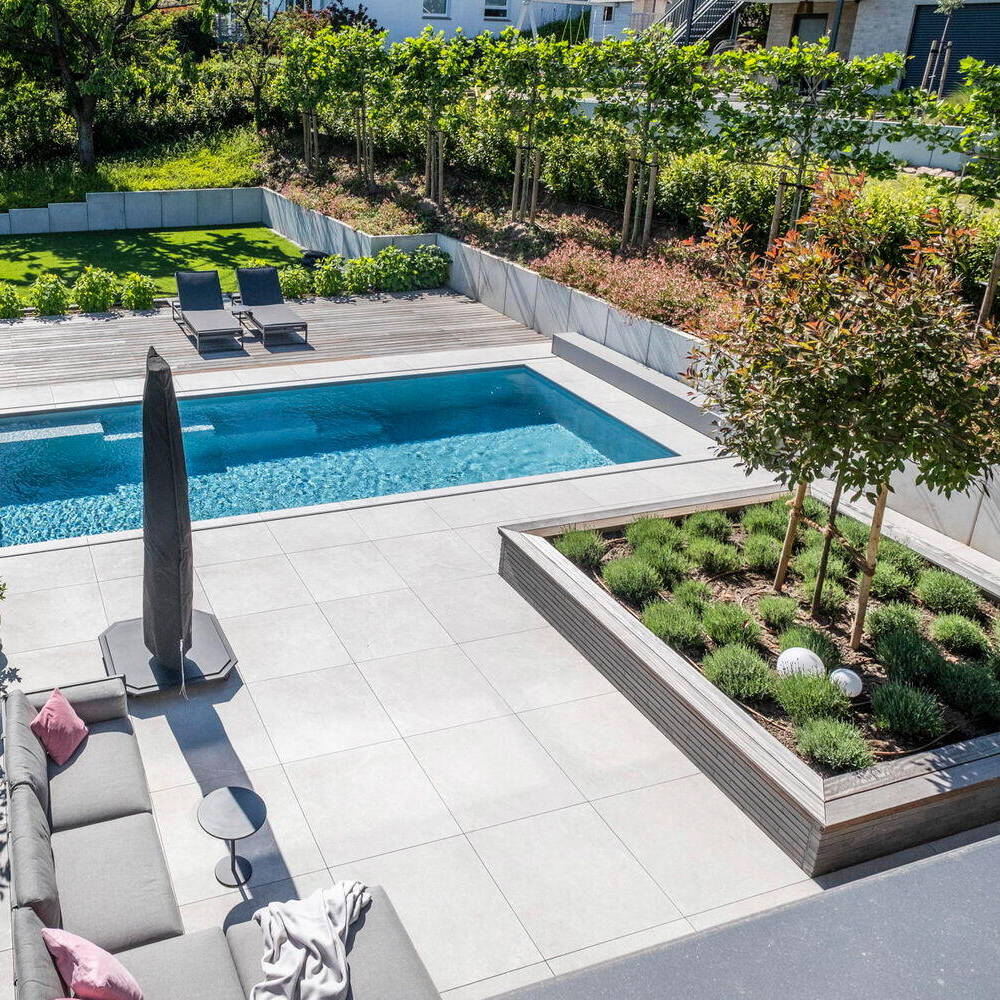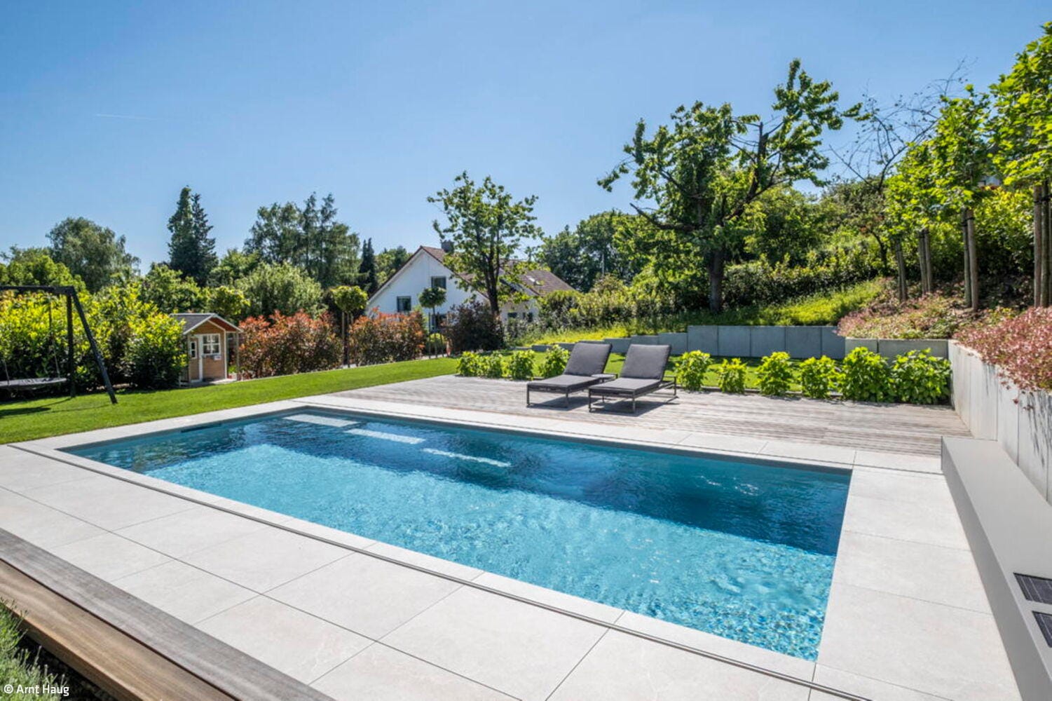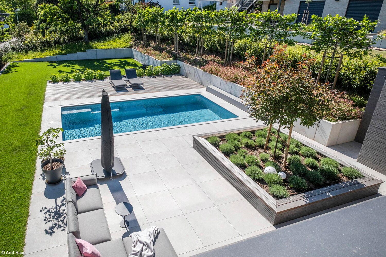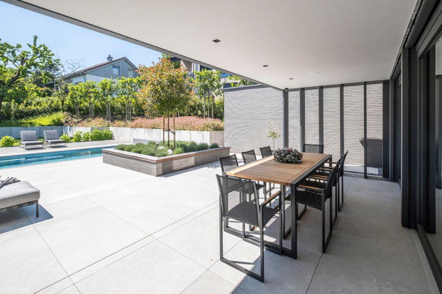 Raised beds around the pool step down the final metre of elevation change while adding textural interest. Espalier trees to the north, paired with the existing cherry trees to the west, establish privacy and screen external views. "The stringent building regulations presented real challenges," Anja Engelshove reflects, "yet they're exactly what gave this home its distinctive presence and made it stand apart."