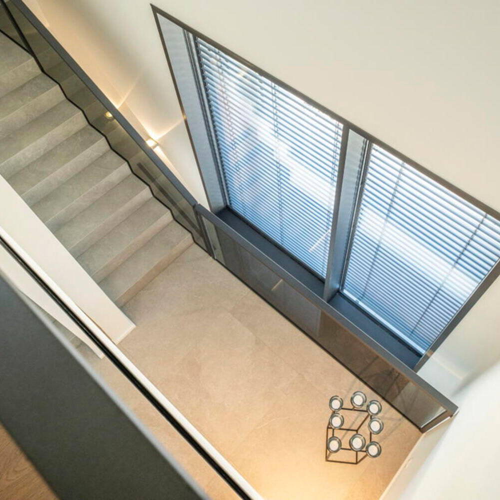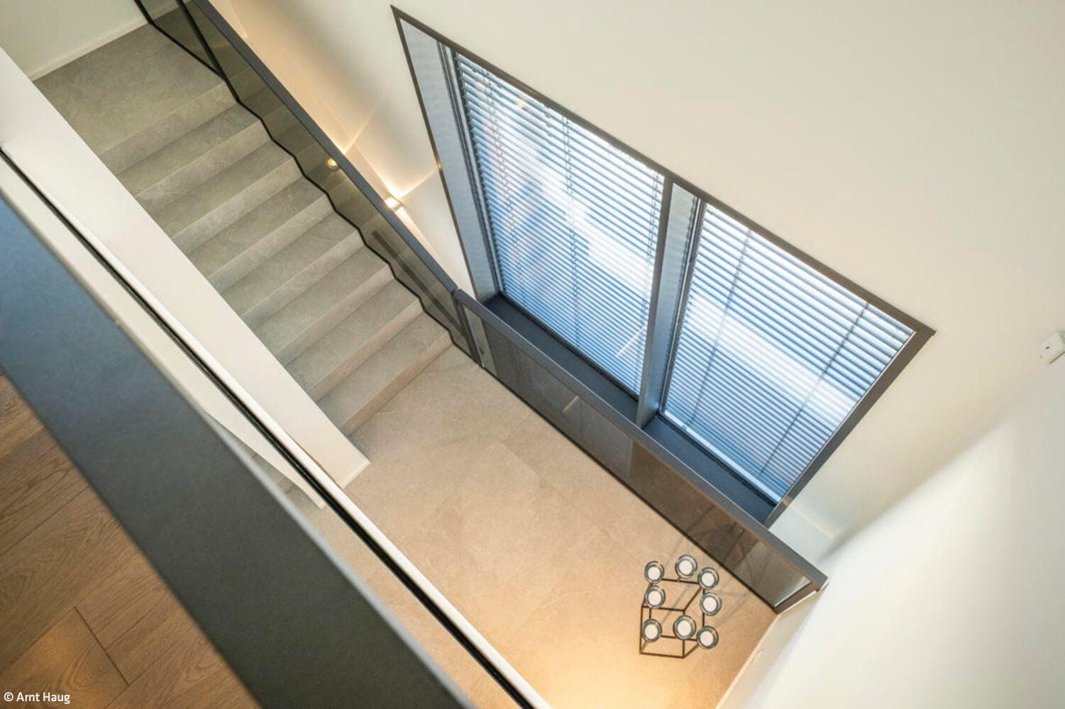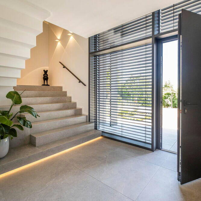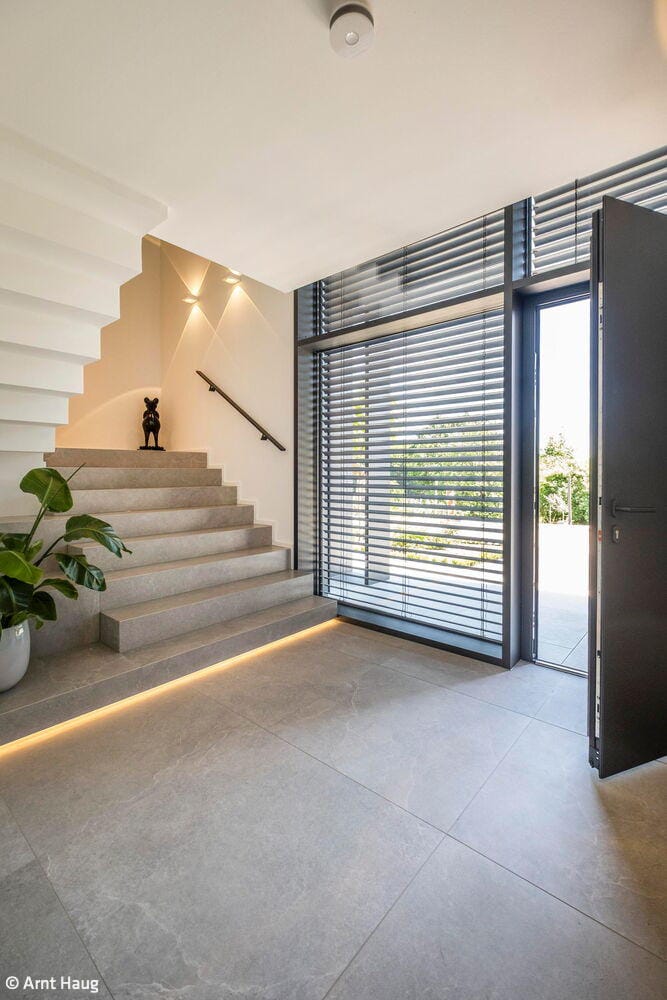 The property opens from the south, where the basement, integrated garage, and entry sequence are located. Visually, this utilitarian zone recedes into the background both outside and in. The entrance itself steps back, creating a weather-sheltered threshold. Aluminium-clad supporting columns define this transition – technically necessary, yet functioning as elegant privacy screens. Floor-to-ceiling glazing floods the entry hall with light, establishing the sophisticated, welcoming atmosphere the clients envisioned. A generous staircase from here guides residents and visitors directly to the living levels.