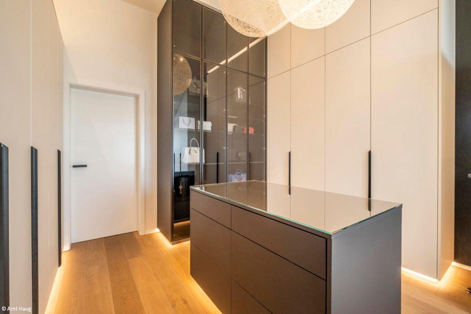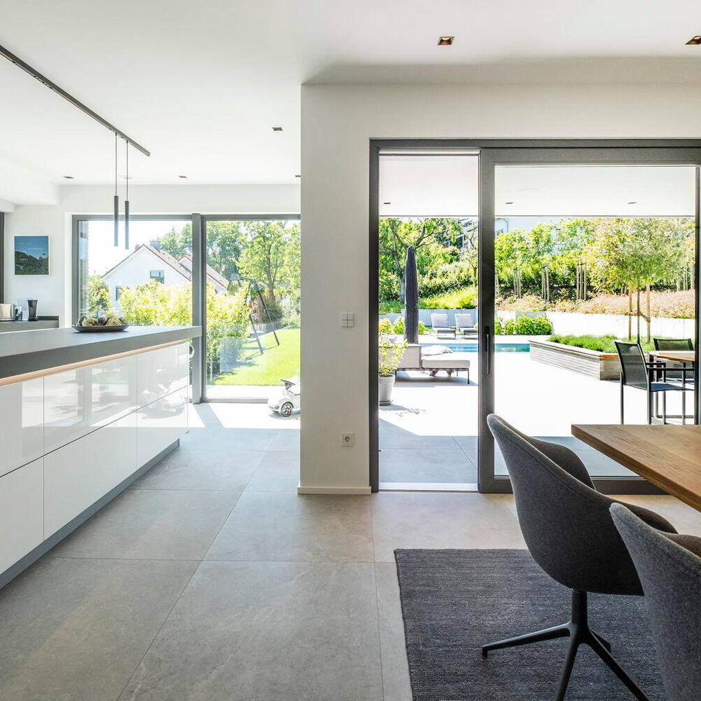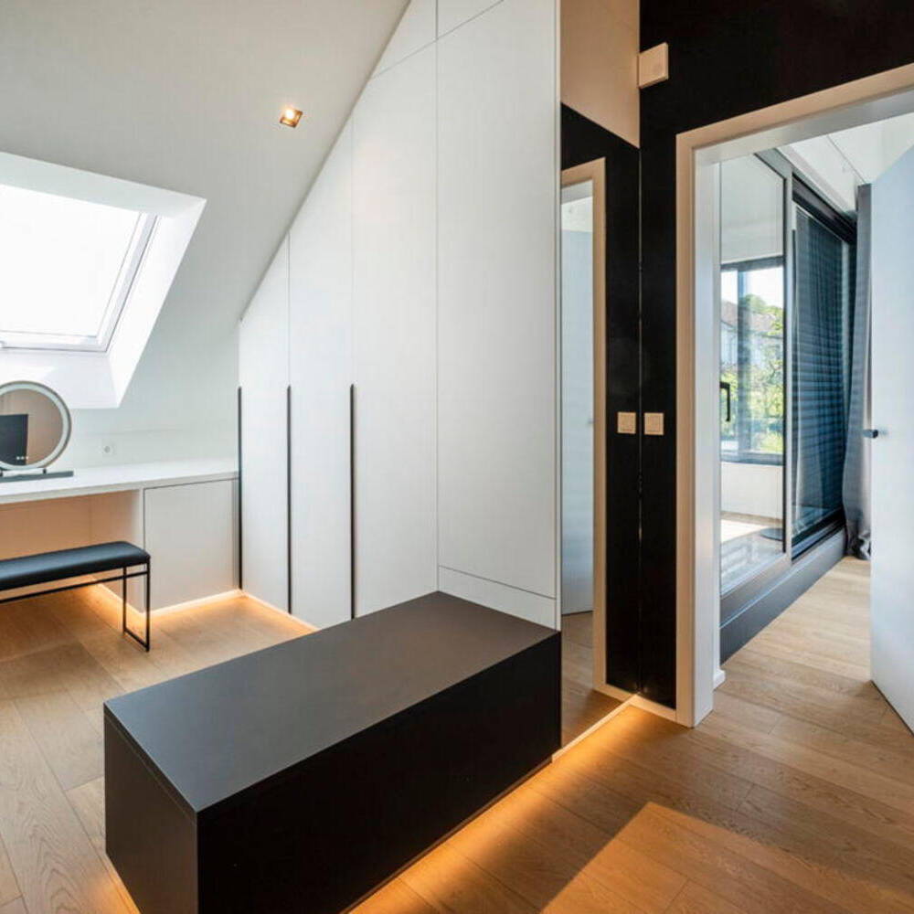 The property opens from the south, where the basement, integrated garage, and entry sequence are located. Visually, this utilitarian zone recedes into the background both outside and in. The entrance itself steps back, creating a weather-sheltered threshold. Aluminium-clad supporting columns define this transition – technically necessary, yet functioning as elegant privacy screens. Floor-to-ceiling glazing floods the entry hall with light, establishing the sophisticated, welcoming atmosphere the clients envisioned. A generous staircase from here guides residents and visitors directly to the living levels.