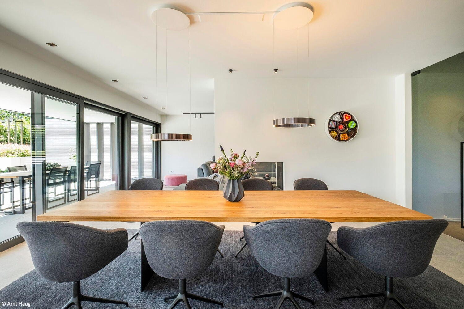 Every room is positioned to engage with the site's topography and orientation. The garden sits three and a half metres above the entry level, extending westward beside the house – the same plane as the living spaces. Full-height glazing dissolves the boundary between interior and garden. A swimming pool, co-designed by Engelshove, adjoins the terrace, anchoring outdoor life. Inside, refinement prevails: a generously proportioned primary suite with dressing room and ensuite, a gas fireplace, designer lighting, custom millwork, premium fixtures, and a sophisticated KNX automation system throughout.