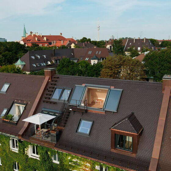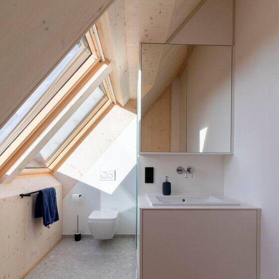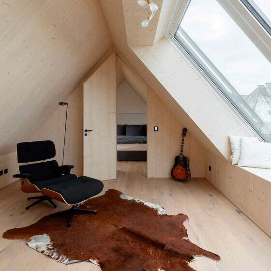 With structural renewal, fire safety, and energy efficiency in mind, architects Urs Fridrich and Benjamin Nejedly of Eneff Architects in Munich opted to replace the original roof structure with prefabricated CLT (cross-laminated timber) panels. Every unused area needed insulation. The existing apartment was stripped back to its foundations, making way for an entirely new layout. The attic floor was designed with flexibility in mind – the right half can be sealed off and function as a separate residential unit, complete with bathroom, two living spaces, and kitchen connections. The left half houses the kitchen, dining area, and living room, while the bathroom and bedroom tuck under the roof ridge, accessed by a narrow staircase. But here's where the conversion truly shines: positioned between the bathroom and bedroom is a multipurpose space – living room, lounge, or studio, depending on the owners' needs – crowned with a sweeping panoramic window and a small balcony-like alcove. Throughout the roofscape, the architect strategically placed windows to fulfill the clients' vision of flooding the space with natural light.