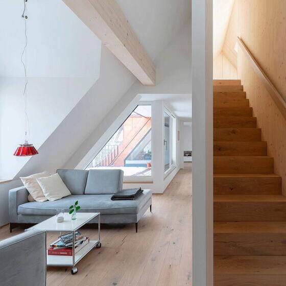The wave of attic conversions shows no signs of slowing – you'd think Munich had exhausted every last roof space by now. When the future owners of this Neuhausen property purchased the attic, they also acquired an existing loft apartment, allowing them to expand the living area to encompass both the attic itself and the previously unused roof peak.