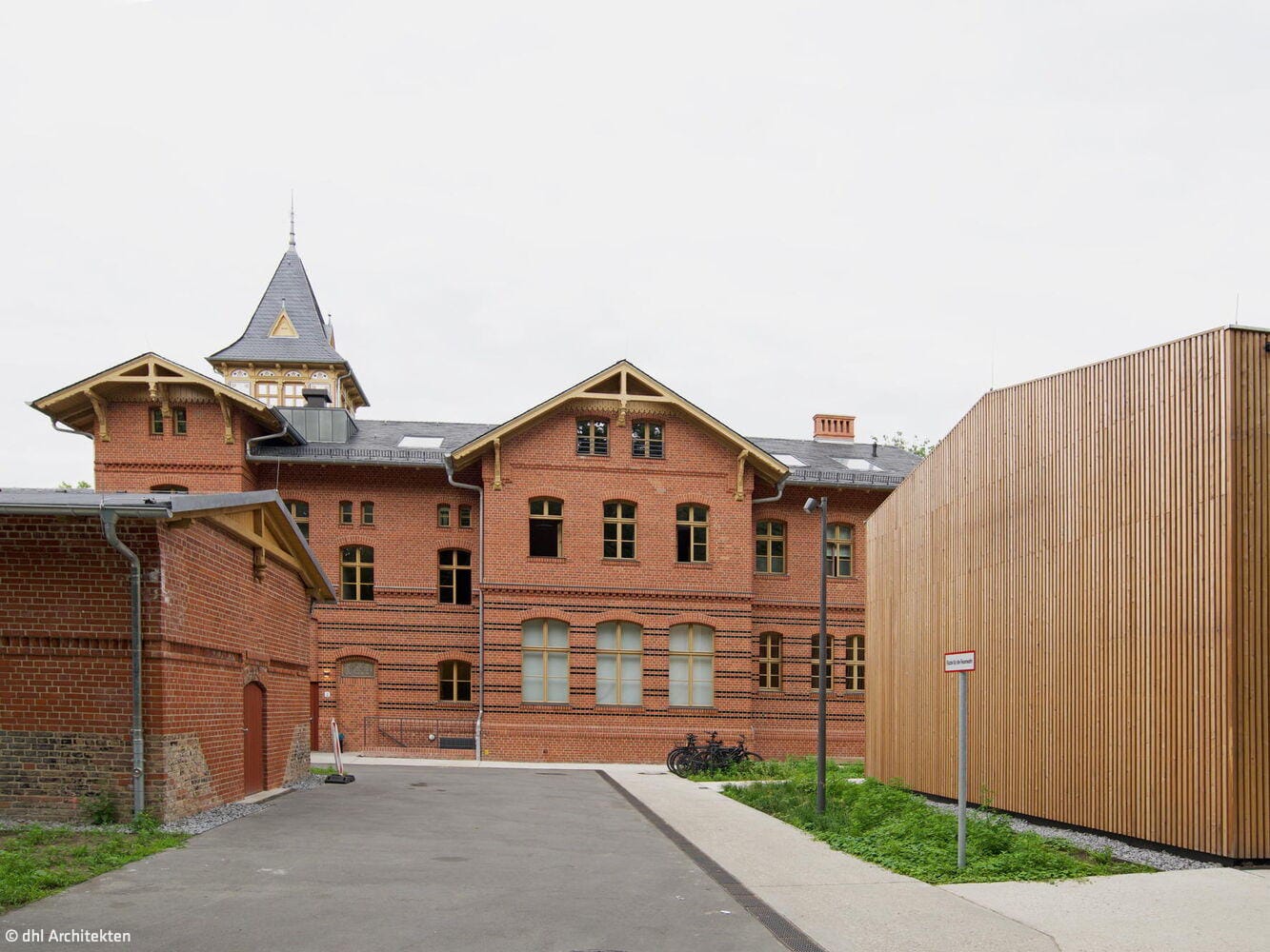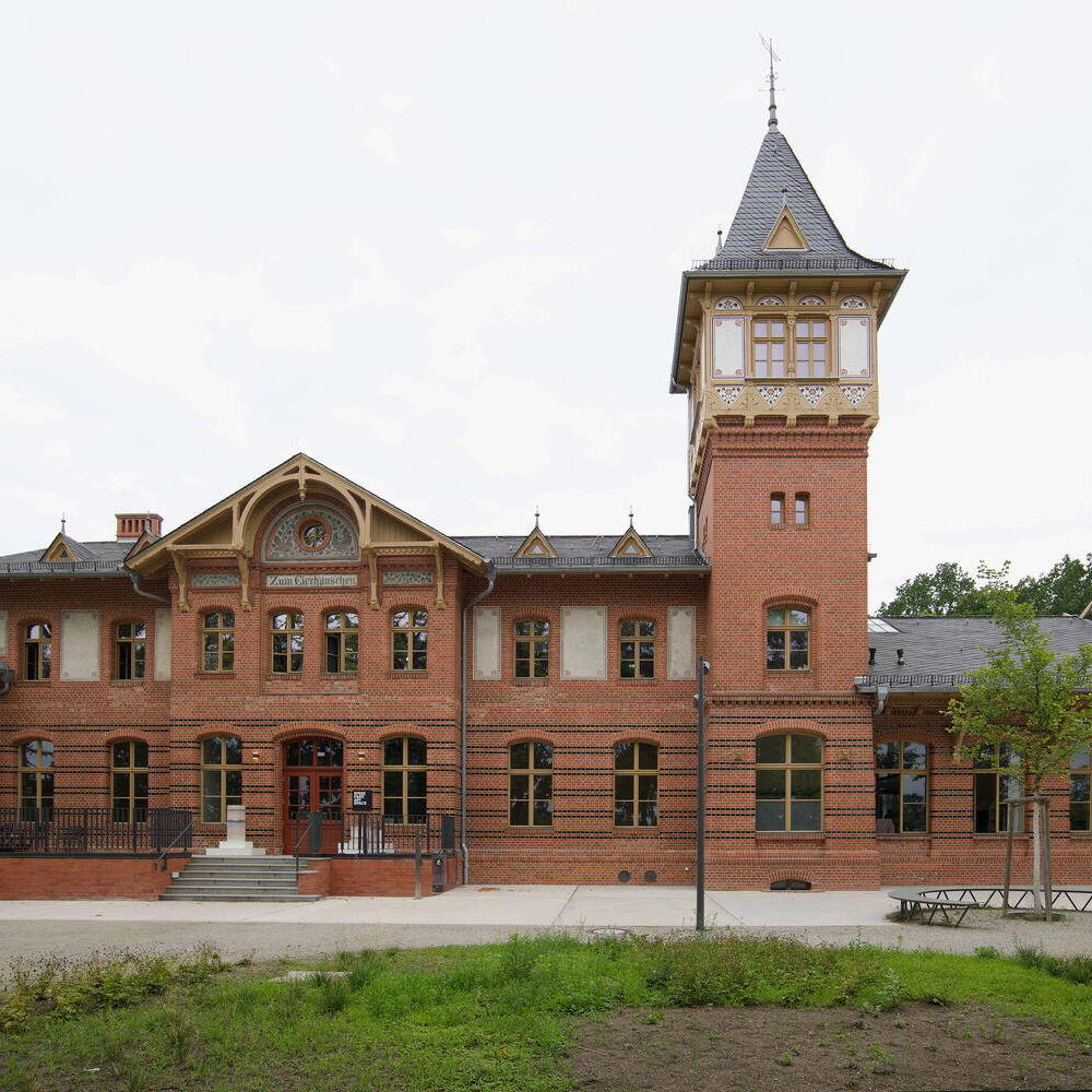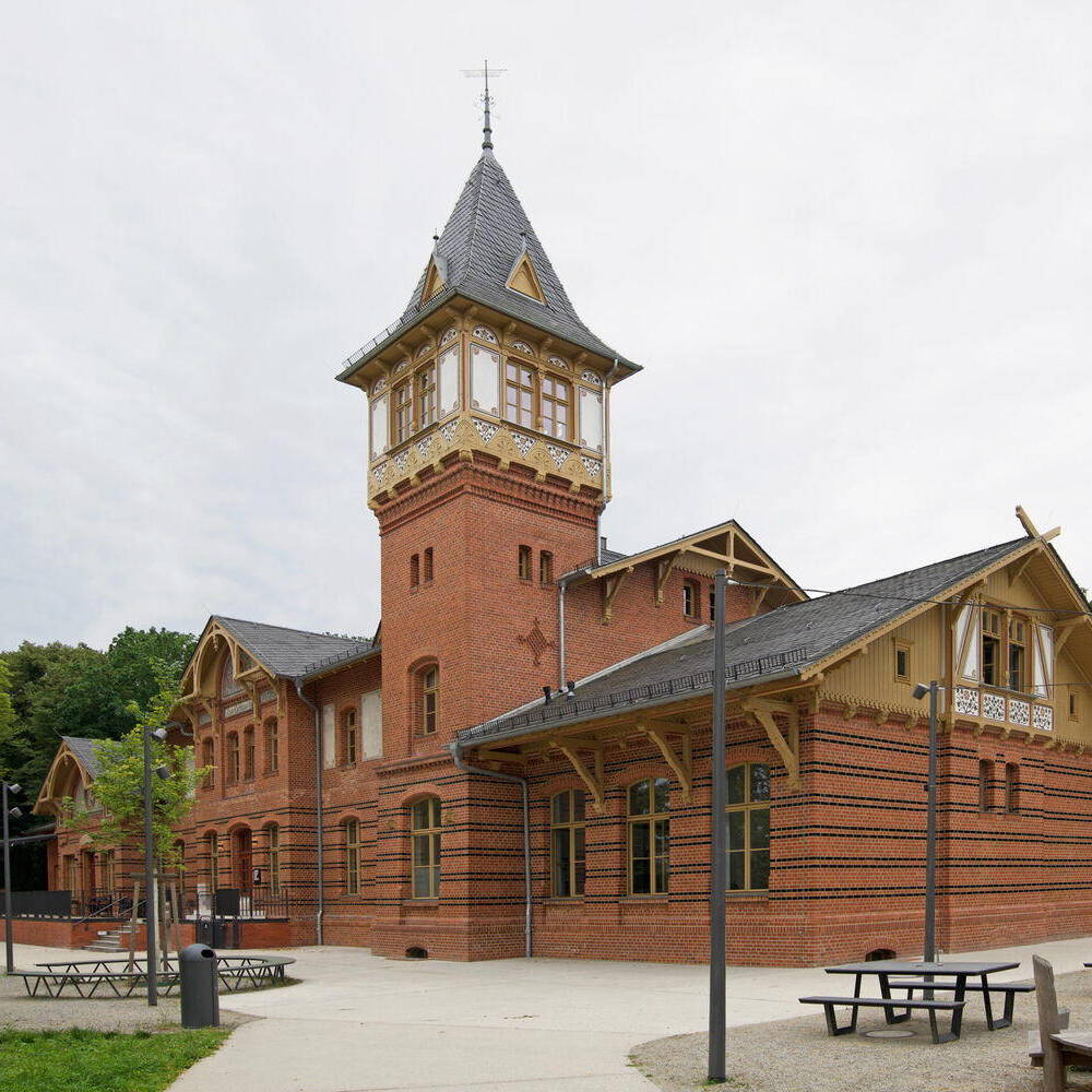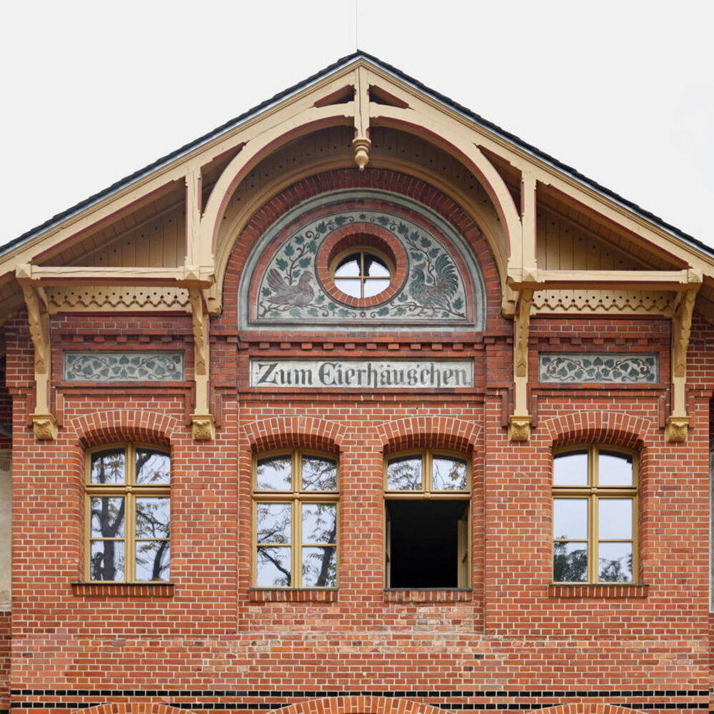 The building bears little trace of its origins as a sailors' pub. Designed by architect Karl Frobenius and erected between 1890 and 1892, it once thrived during the GDR era as a beloved riverside destination on the Spree, complemented by the neighboring Spielpark amusement park. When the park closed, the site fell into decline—overgrown, vandalized, and increasingly forgotten. What had become a true "lost place" was rescued from obscurity in 2017 by the State of Berlin, which reacquired the property. Following an intensive four-year restoration and renovation led by the architectural firm Detlev Höing-Langguth (dhl Architekten), the venue reopened in 2024 as a restaurant and beer garden, now anchoring the "Spreepark Art Space" with rotating exhibitions. The comprehensive restoration involved the complete renovation of the existing ensemble, the addition of a new structure, and full architectural coordination across all project phases. The 2,300 m² Frobenius Building was meticulously restored according to heritage conservation standards: its distinctive tall, pointed tower is once again a landmark visible from afar, while the ornate wooden gable of the two-story main building gleams with renewed brilliance. Both structures feature red brick facades. The classical brickwork—with its varied formats, colors, and decorative elements—was painstakingly preserved. The original black glazed stone layers were restored to the existing building's façade as a defining architectural feature. A new 900 m² wing housing the kitchen has been added on the west side, seamlessly connected to the original structure by a glass bridge. The south section now features a spacious dining hall with an adjoining terrace and beer garden extending toward the Spree, where landscaping continues to develop. The new operators have named their establishment "EI-12437-B".