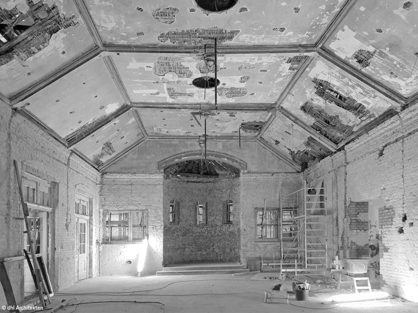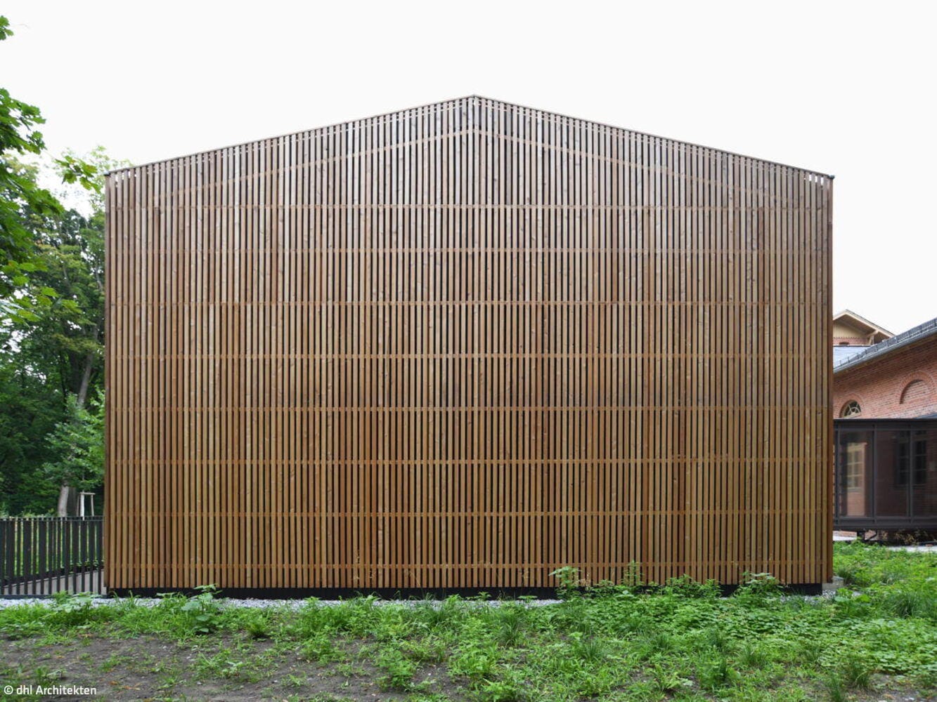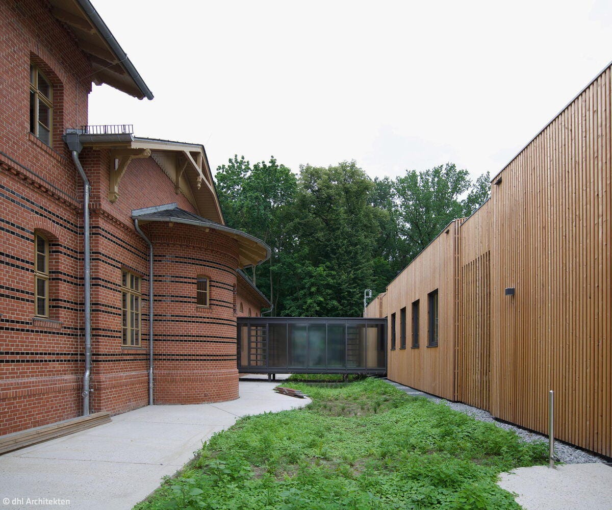 The building bears little trace of its origins as a sailors' pub. Designed by architect Karl Frobenius and erected between 1890 and 1892, it once thrived during the GDR era as a beloved riverside destination on the Spree, complemented by the neighboring Spielpark amusement park. When the park closed, the site fell into decline—overgrown, vandalized, and increasingly forgotten. What had become a true "lost place" was rescued from obscurity in 2017 by the State of Berlin, which reacquired the property. Following an intensive four-year restoration and renovation led by the architectural firm Detlev Höing-Langguth (dhl Architekten), the venue reopened in 2024 as a restaurant and beer garden, now anchoring the "Spreepark Art Space" with rotating exhibitions. The comprehensive restoration involved the complete renovation of the existing ensemble, the addition of a new structure, and full architectural coordination across all project phases. The 2,300 m² Frobenius Building was meticulously restored according to heritage conservation standards: its distinctive tall, pointed tower is once again a landmark visible from afar, while the ornate wooden gable of the two-story main building gleams with renewed brilliance. Both structures feature red brick facades. The classical brickwork—with its varied formats, colors, and decorative elements—was painstakingly preserved. The original black glazed stone layers were restored to the existing building's façade as a defining architectural feature. A new 900 m² wing housing the kitchen has been added on the west side, seamlessly connected to the original structure by a glass bridge. The south section now features a spacious dining hall with an adjoining terrace and beer garden extending toward the Spree, where landscaping continues to develop. The new operators have named their establishment "EI-12437-B".