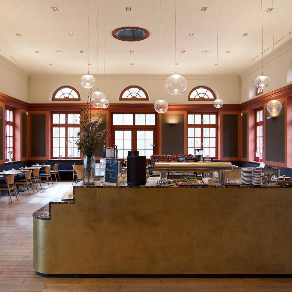 The Berlin-based Wiewiorra Studio shaped the interior design strategy. A striking golden counter, positioned at the room's heart, anchors the space. Furnishings elsewhere adopt a restrained, functional aesthetic. Wall colours draw inspiration from the original deep red discovered during restoration. The interior accommodates 70 guests comfortably; during warmer months, the beer garden welcomes an additional 250.