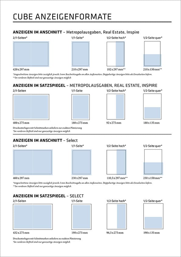 CUBE bietet mit seinen CUBE Metropolausgaben, der CUBE Select, CUBE Inspire, CUBE Real Estate und der CUBE Website Werbetreibenden die Möglichkeit, hochwertige Produkte und Dienstleistungen mit geringen Streuverlusten in einer hoch interessanten und zahlungskräftigen Zielgruppe zu platzieren. Mehr Informationen finden Sie in den nachfolgenden Mediadaten.