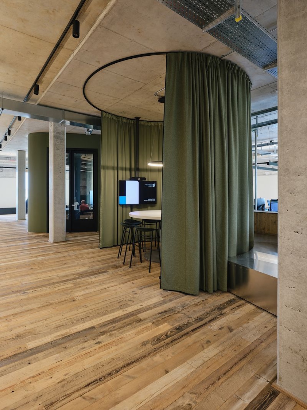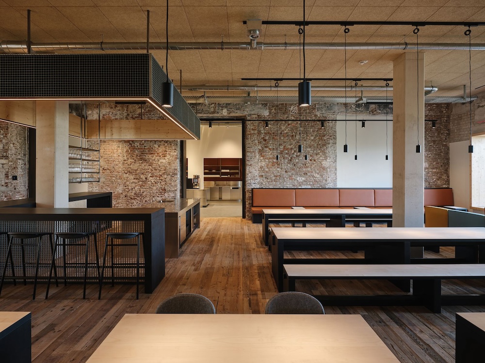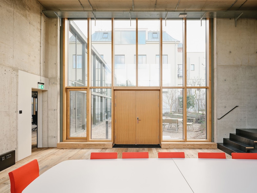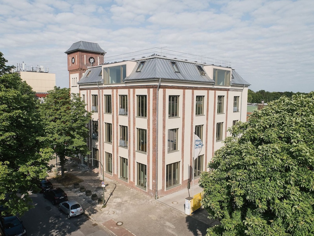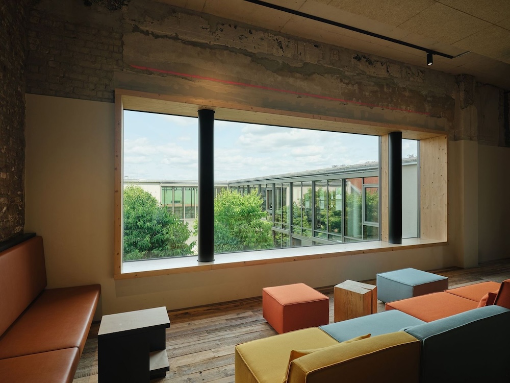 Der historische Charakter des Gebäudes wurde innen wie außen sichtbar erhalten und mit moderner Smart-Building-Technologien kombiniert, die Beleuchtung, Sonnenschutz und die nachhaltige Energieversorgung des Gebäudes steuern.Der Energiebedarf konnte dabei signifikant auf ein Drittel des früheren Verbrauchs reduziert werden, wobei die Energie fast ausschließlich aus eigener Energieproduktion bezogen wird. Ein Dreiklang aus Eisspeicherheizung, Geothermie und Photovoltaik sorgt für eine effiziente Beheizung und Kühlung und deckt zugleich den Strombedarf für beides. Das Interior-Konzept wird durch innovative, flexible Arbeitsräume/-flächen geprägt. Jede der vier Etagen hat einen anderen Grundriss und wurde individuell für fixe oder flexible Arbeitsoptionen gestaltet. Die Gebäudekubatur mit bis zu 4,50 m Deckenhöhe bot optimales Potenzial Höhen auszunutzen und großzügige Open Space Bereiche zu schaffen. Eine Kombination aus Open-Space sowie fünf jeweils farblich monochrom gestalteten „Digitalen Fenstern“ (=akustisch optimierte Hybridräume für Teams Calls oder Rückzugsorte), sieben „Werkstätten“ (=Konferenzräume) und „Lagerfeuern“ (=Besprechungsinseln) verteilen sich über das gesamte Gebäude und bieten jedem Mitarbeitenden den jeweils optimalen Workspace. Zusammen mit Lounge Ecken und Sitztreppen unterbrechen sie bewusst die bürotypische Tisch-an-Tisch- Anmutung. Zugleich ist das Design zukunftsorientiert: Durch flexible Möblierung und Raumeinteilungen mit Akustik-Vorhängen sowie einem intelligenten Lichtkonzept passt es sich unkompliziert wechselnden Arbeitsanforderungen an.