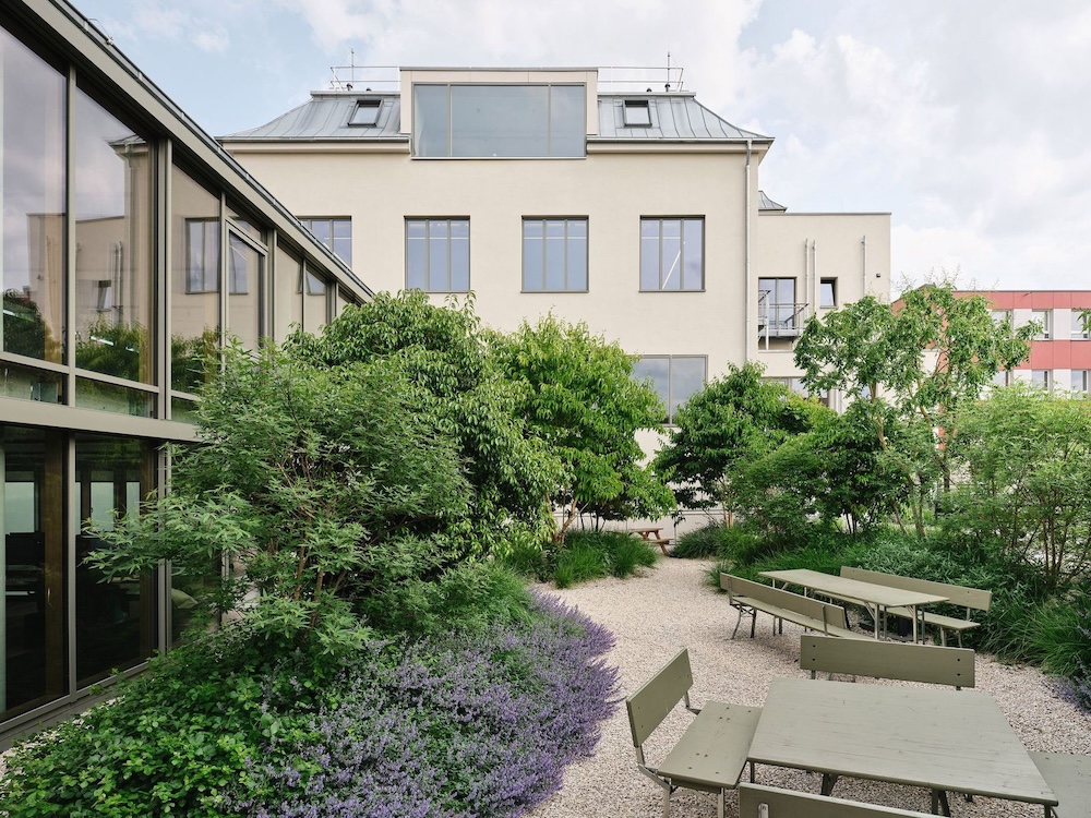 Das Herzstück der Agentur befindet sich auf der ersten Etage: Ein großzügig angelegtes Esszimmer mit Küche und Bar lädt Belegschaft und Gäste zu Tisch oder an die Theke. Das sechs Meter breite Panoramafenster bietet einen erholsamen Blick auf den begrünten Innenhof und die beiden neu hinzugefügten Gebäudeteile – zwei große gläserne Werkstätten, die mir einer lichten Raumhöhe von 4,50 m ganz unterschiedlichen Nutzungen zur Verfügung stehen. Neben dem Esszimmer bieten der Verbindungsbau zu den Werkstätten und der großzügig mit vielen klimaresistenten Bäumen und Sträuchern bepflanzte Innenhof viel Platz für soziale Interaktion – sei es beim Tischtennis, Kickern oder spontanen Grill-Events. Große Fenstergauben in alle vier Himmelsrichtungen sowie eine Terrasse gewähren im Dachgeschoss weite Ausblicke über Düsseldorf.