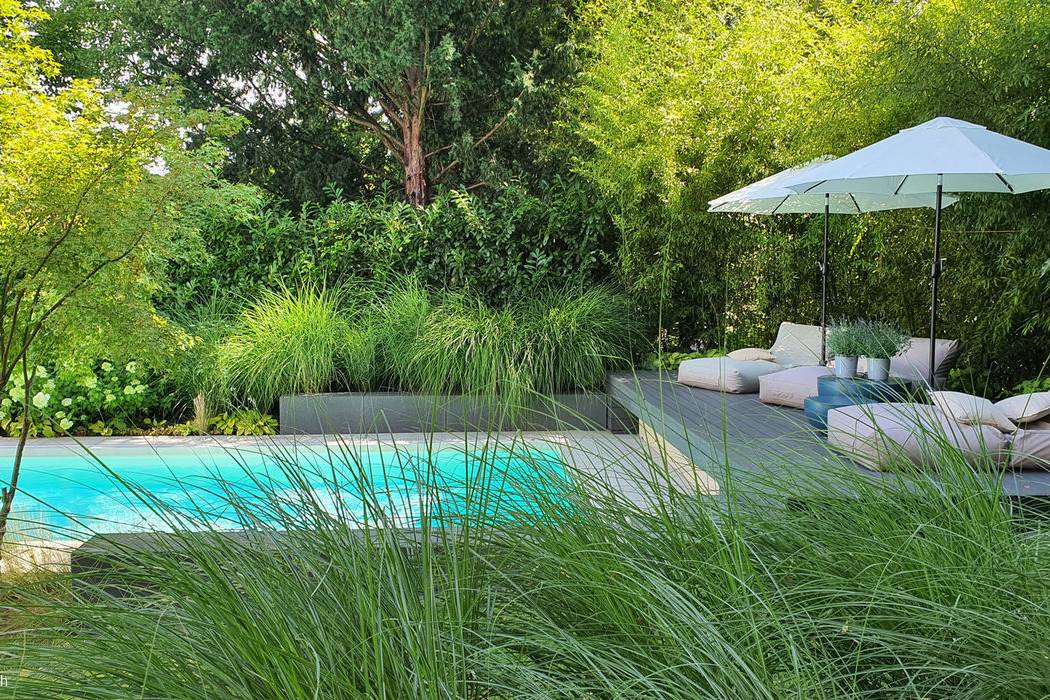 Kindgerechter und pflegeleichter Garten mit modernen Strukturen für eine Familie