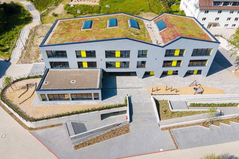 Eine Grundschule mit Sporthalle verbindet kommunikative Lern- und Außenräume