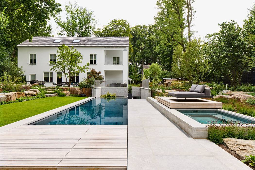 Familiengarten für ein neues Wohnhaus mit Nutz-/Naschbereich und Schwimmbad