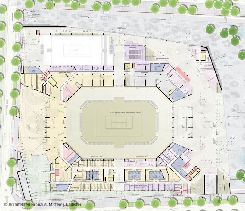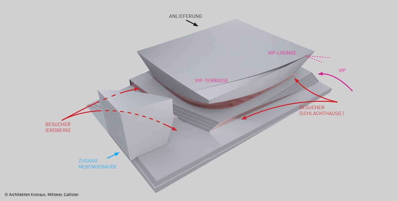 „Das Siegerprojekt von Kronaus/Mitterer/Gallister weist in seiner baukünstlerischen Lösung eine hervorragende Qualität auf. Das Raum- und Funktionsprogramm, die Lage der einzelnen Nutzungsbereiche und deren schlüssige Verknüpfung miteinander, die Funktionalität der Erschließung im Äußeren und Inneren sowie die Flexibilität für unterschiedliche Veranstaltungsformate sind sehr gut erfüllt. Gleichzeitig hat das Siegerteam das Ziel der Ausloberin einer ökologisch, ökonomisch und sozial nachhaltigen sowie energieeffizient betreibbaren Multifunktions-Arena in hohem Ausmaß erreicht“, so die Expertise des Preisgerichts unter dem Vorsitz von Architekt András Pálffy.